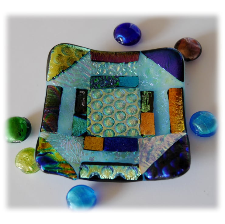 A little, 8 cm square dish, twice times fired in my kiln, first to full fuse all the glass together, 2nd to slump it over a little mould into a shallow dish shape.