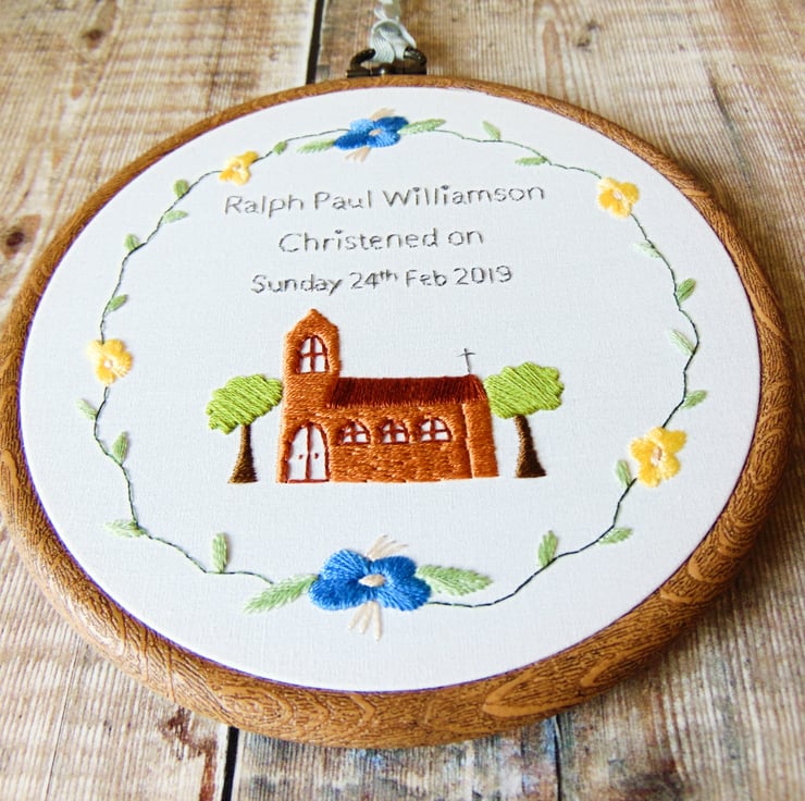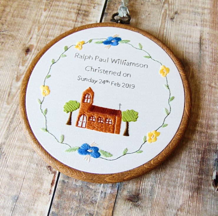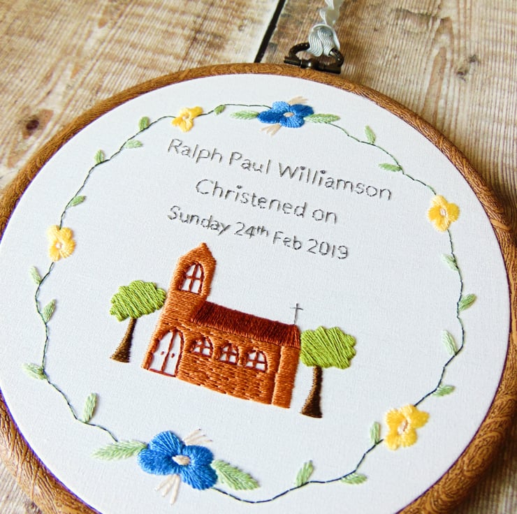 Church Wreath is a lovely Christening theme hoop by The Flossy Stitch. It features a beautiful hand stitched church with trees, any text of your choosing surrounded by a wreath of flowers and greenery. The colours can be anything you'd like which makes it perfect as a gift for a baby boy or girl and particularly nice as a Christening gift. Sewn onto white cotton and set in a six inch hoop.