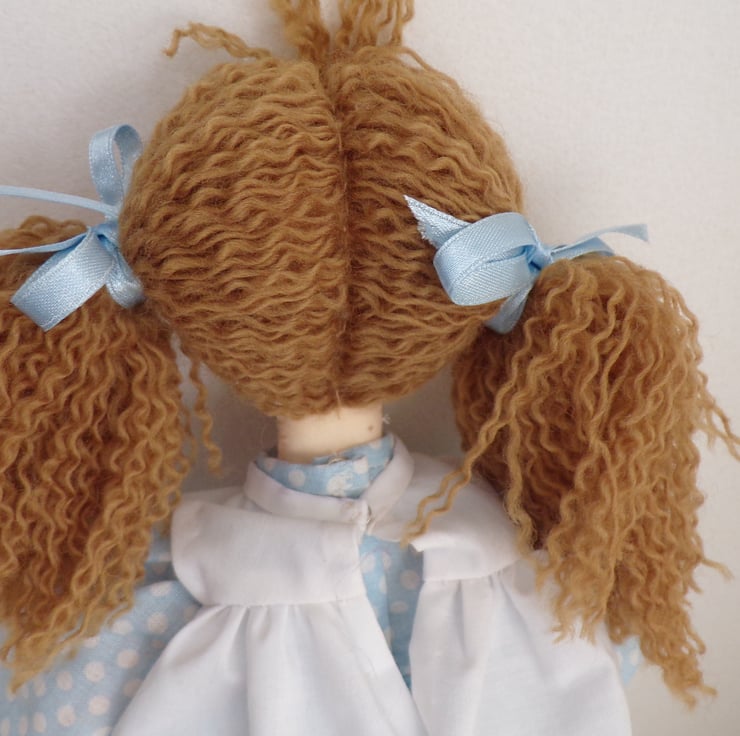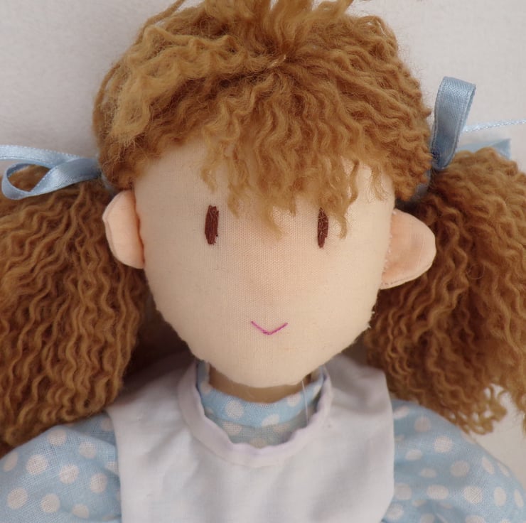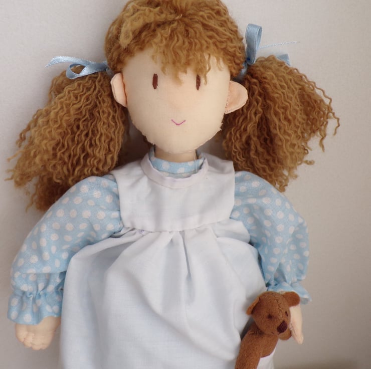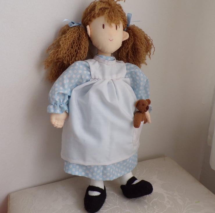 Molly is a lovely hand sewn 14 inch rag doll, she is made out of 100% cotton material and is stuffed with polyester filling. She is wearing a removable pale blue coloured dress with white polka dots, she has a cute pair of bloomers on under the dress and has little black shoes and matching blue ribbons in her hair. Molly also has an apron with her own little teddy bear that she carries around in her pocket.