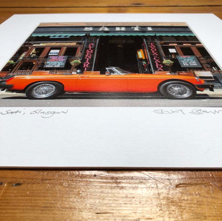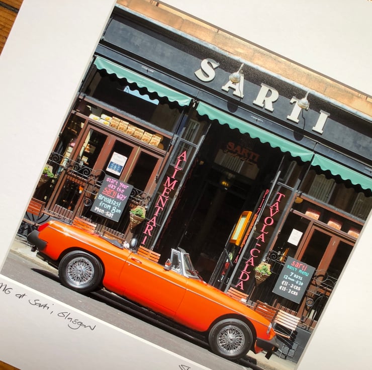 A signed mounted print of my MG at Sarti photograph featuring a beautiful vibrantly coloured classic car and an instantly recognisable Glasgow backdrop