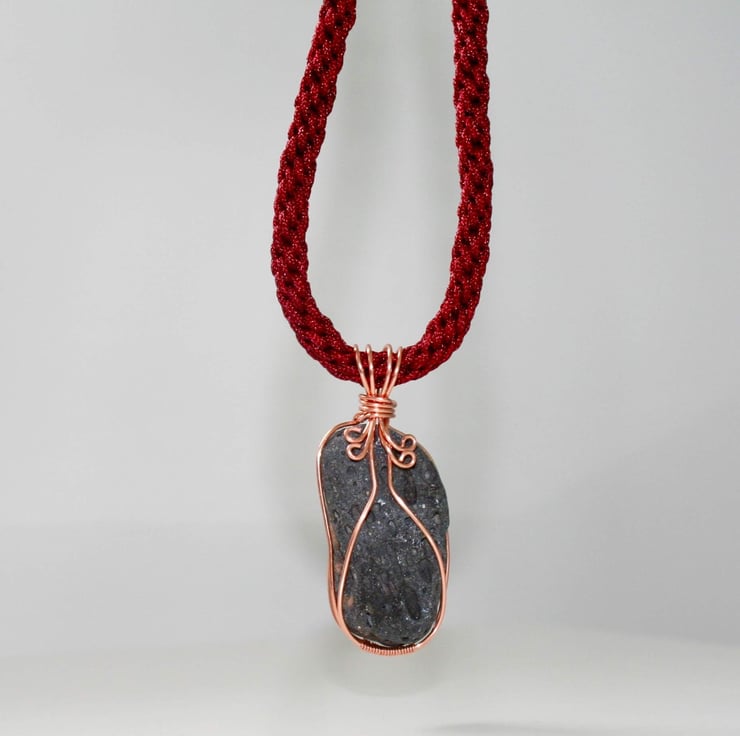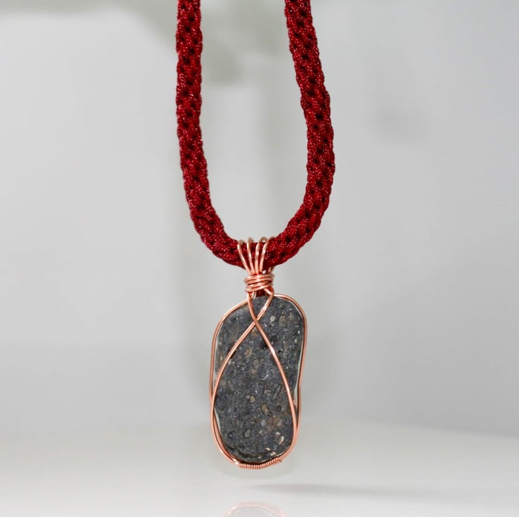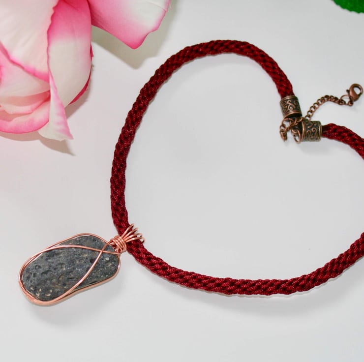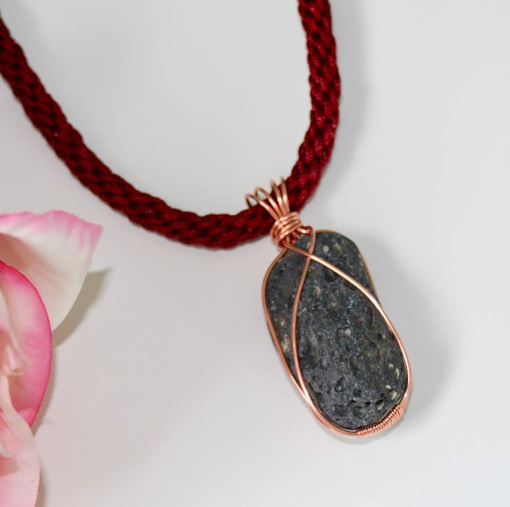 An unusual and unique necklace using a natural black lava stone that is wire-wrapped with bare copper wire and suspended from a kumihimo braid of maroon coloured thread.