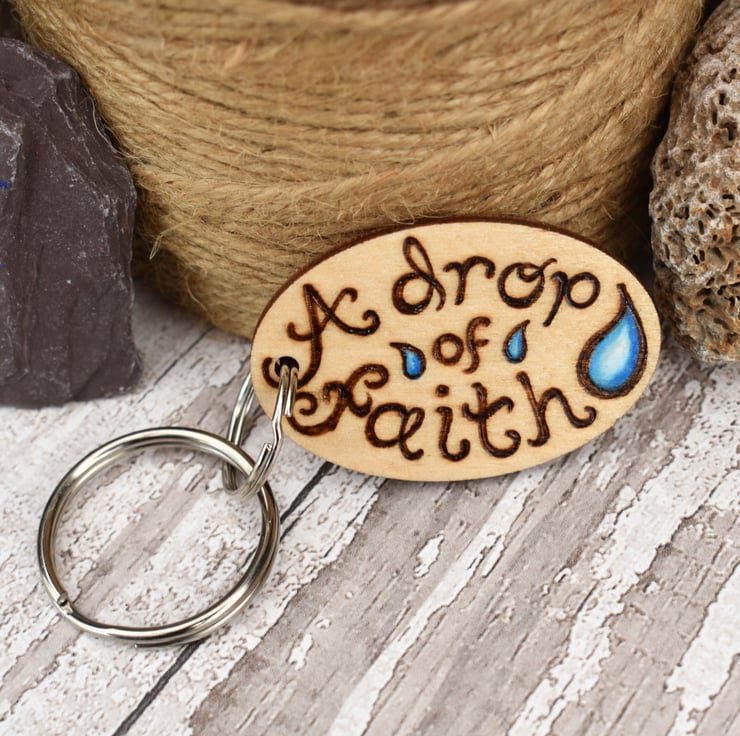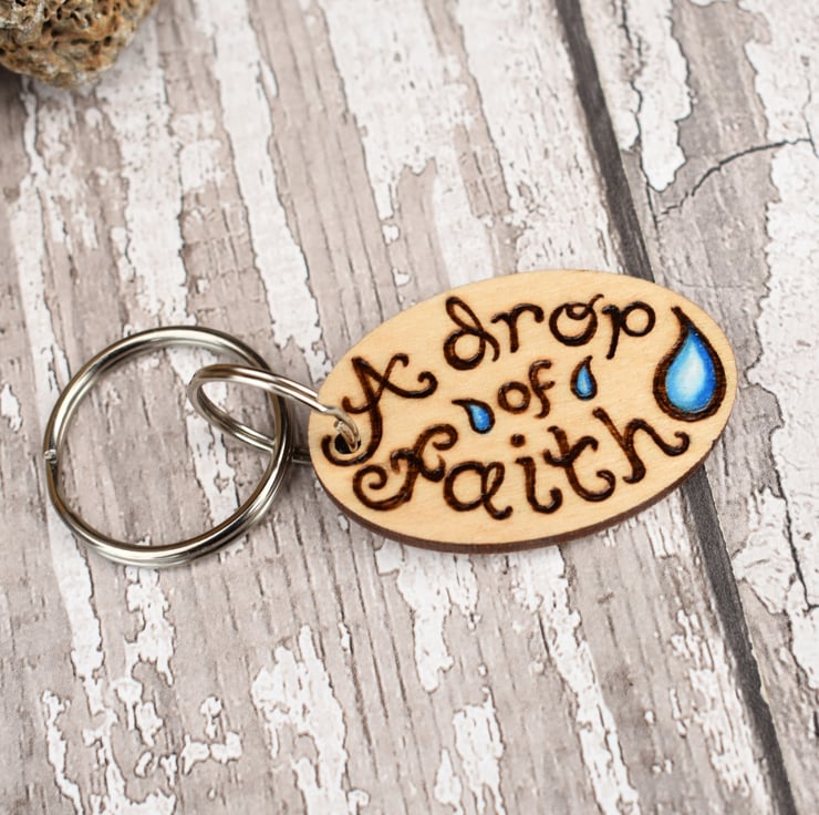 Personalised 'Drop of Faith' keyring, hand burned using pyrography or wood burning.