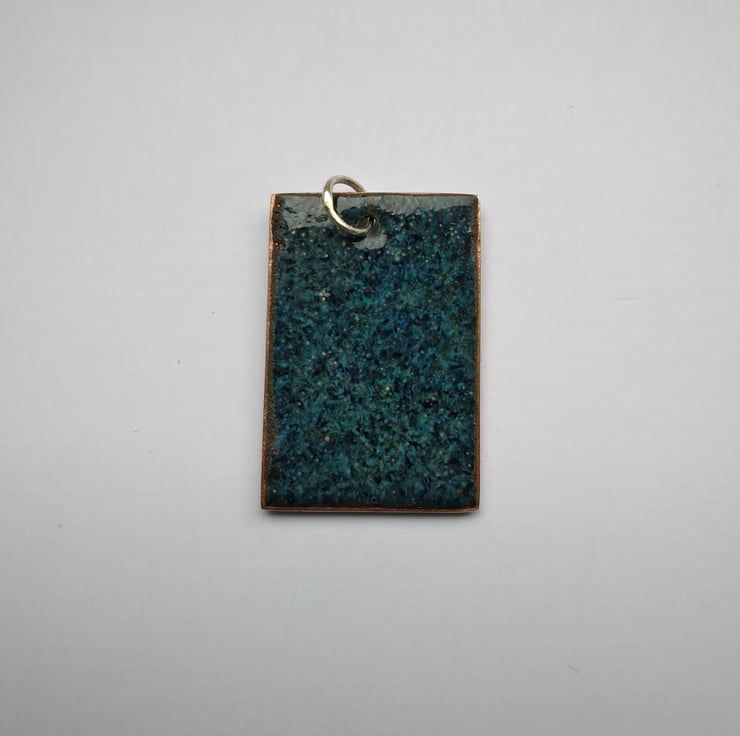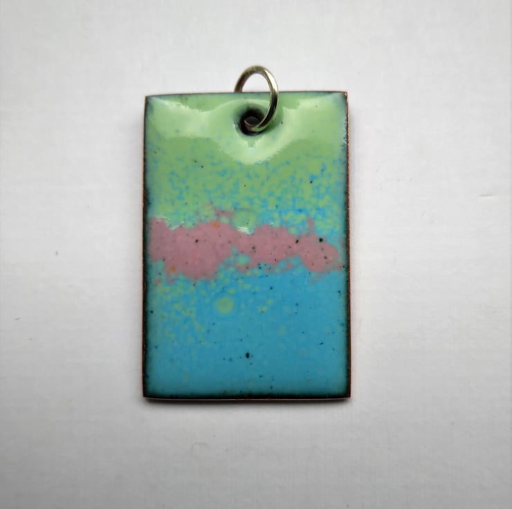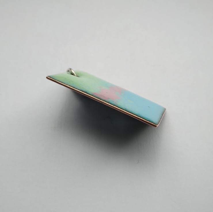 Rectangular enamelled copper pendant In shades of pale blue, pale green and pink. The pendant has been kiln-fired and measures 19mm wide and 29mm tall. To complete the piece aesthetically and for a smooth finish against the skin, the back has been given two coats of dark blue tweed-effect enamel. It comes complete with a soldered sterling silver jump ring and is supplied with an 18" silver plated snake chain and a little organza pouch.