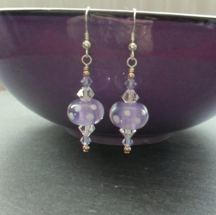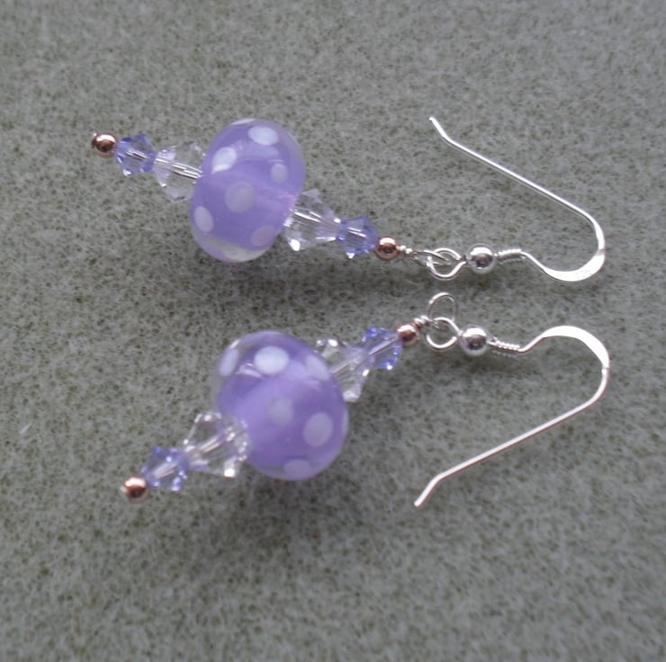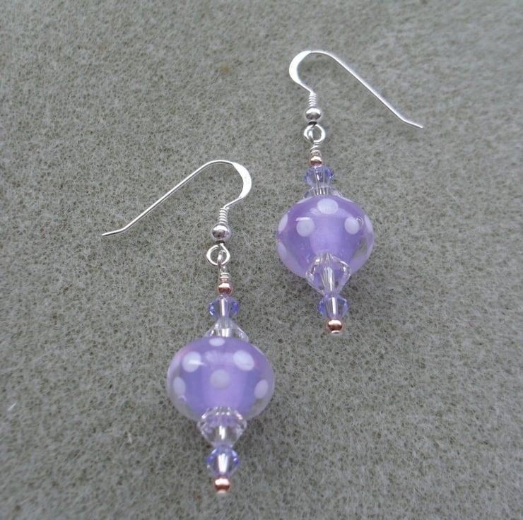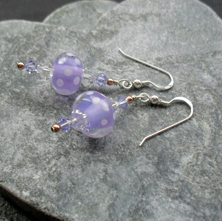 Sterling silver earrings with lovely handmade lampwork glass beads made in the UK which are lilac with little white dots and Clear and tanzanite coloured swarovski® crystals.The earrings also have small rose gold vermeil beads