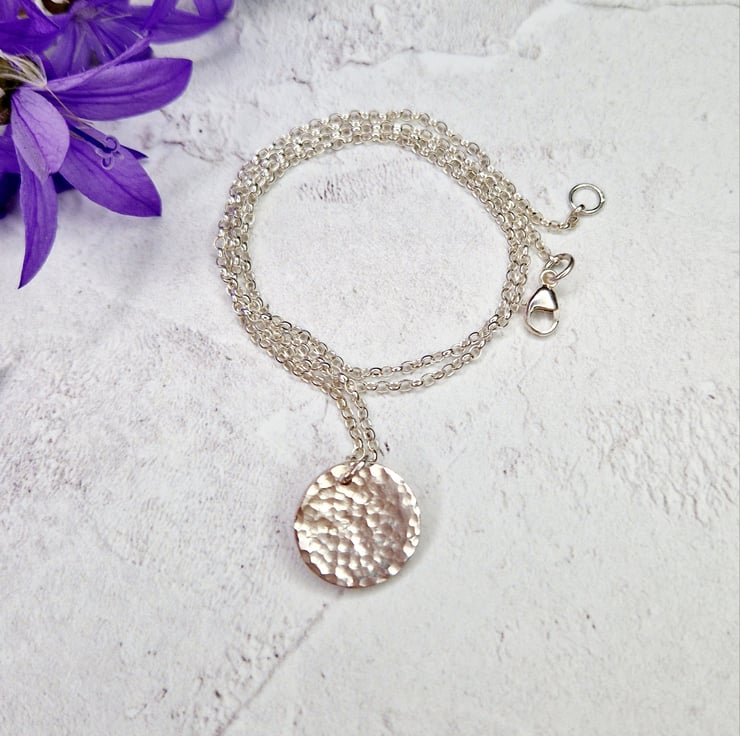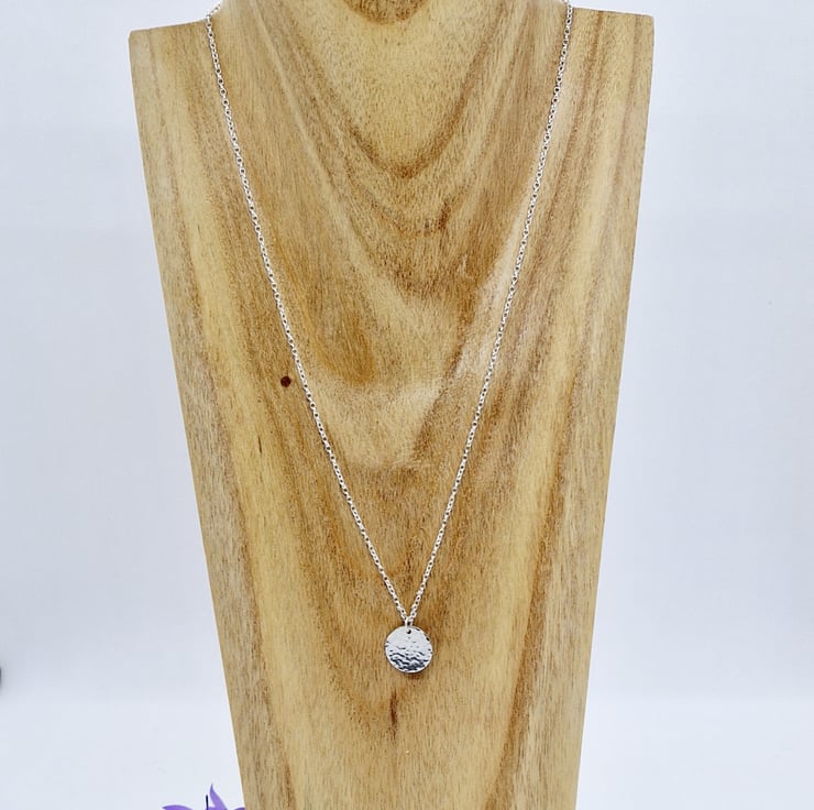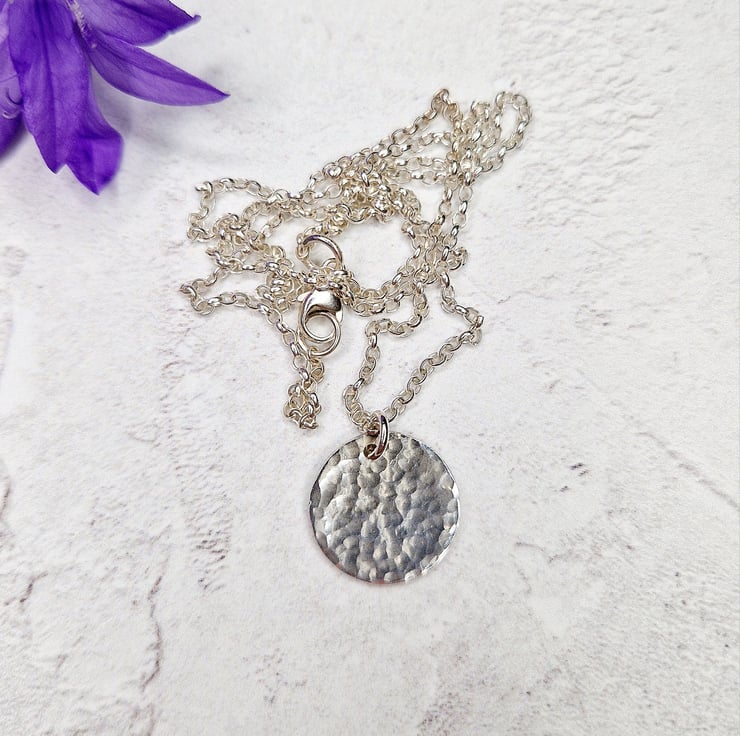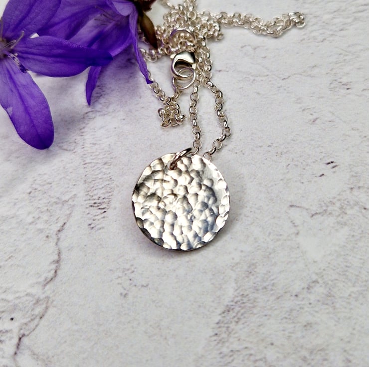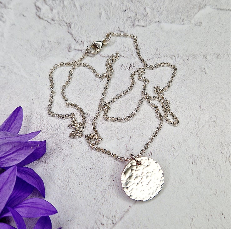 The 15 mm silver disc is lightly hammered and polished by hand, it hangs on a simple but elegant slender mid length, 50 cm, chain and is fastens with a trigger clasp. All the components used in this necklace are made of sterling silver.
