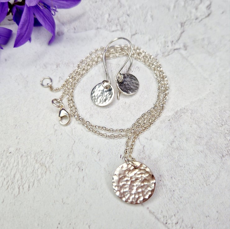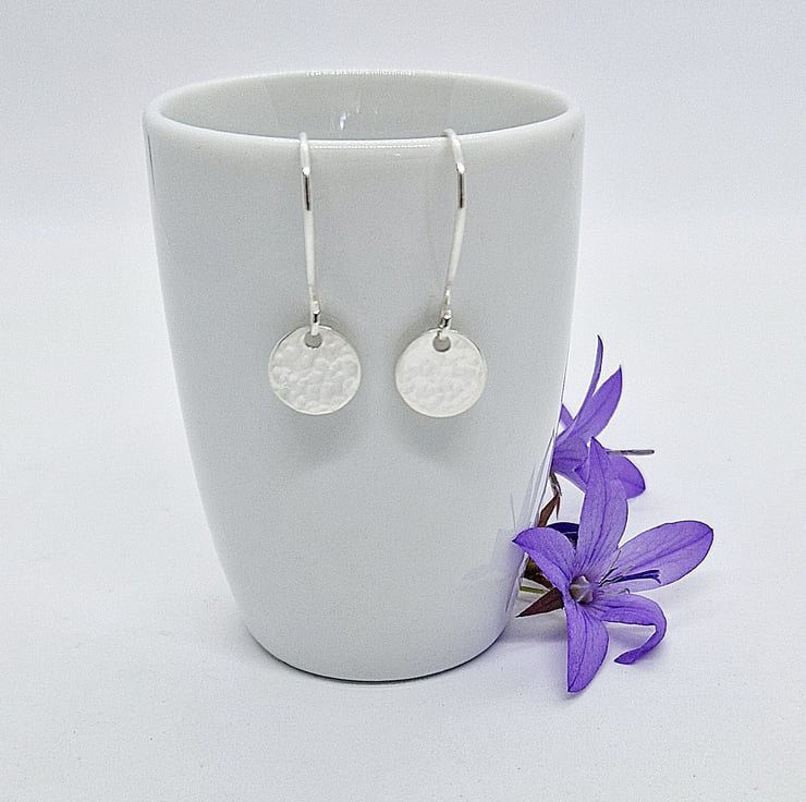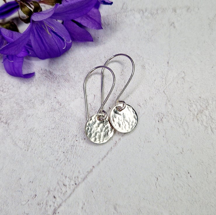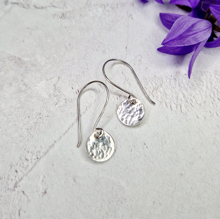 Each dainty disc is lightly hammered and polished by hand, they are the 10 mm in diameter and hang on handmade ear wires, the earrings are approximately 30 mm in length.