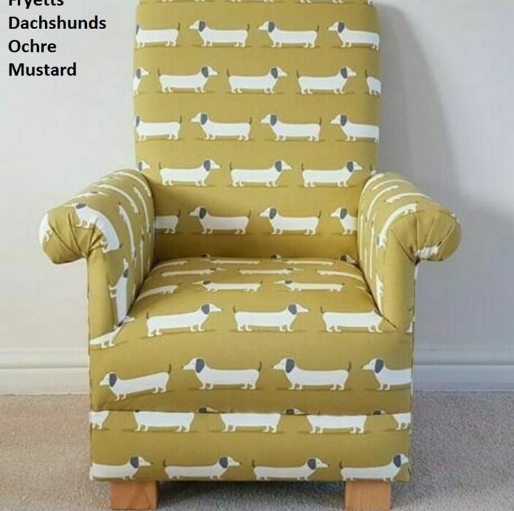 I am a professional upholsterer with over 33 years experience, and have made this sturdy little CHILD’S chair, using Fryetts Hound Dogs fabric in Mustard Ochre