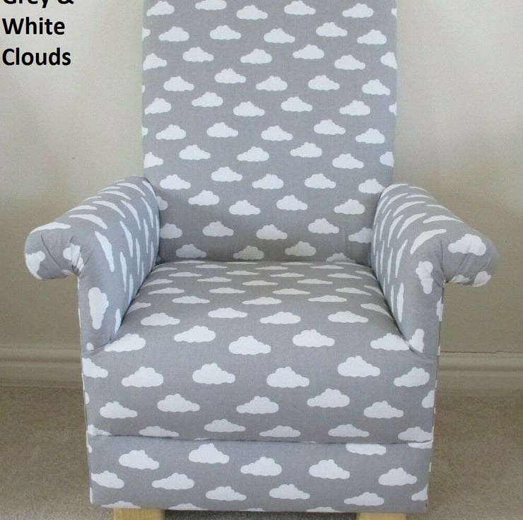 I am a professional upholsterer with over 33 years experience, and have made this sturdy little CHILD’S chair, using Grey & White Clouds fabric.