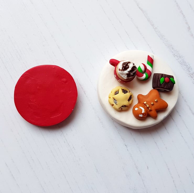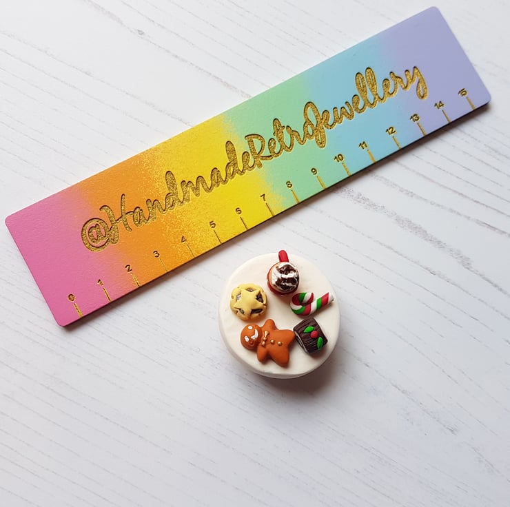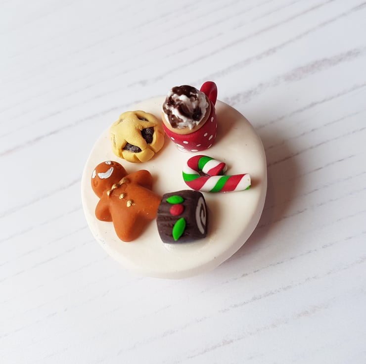 This gorgeous piece is hand crafted by myself using polymer clay, with a white coloured disc base, and includes a selection of Christmas themed treats on top including: a gingerbread man, yule log, mince pie, candy cane, and of course, a hot chocolate cup, complete with hand painted snow pattern dots, and whipped cream with chocolate sauce drizzled over!