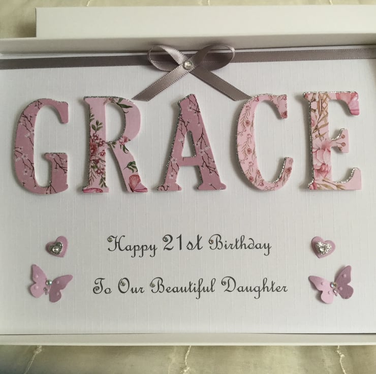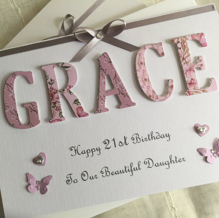 This handmade personalised card is A5 in size ( 210mm x 150mm) and is on 300gsm heavyweight linen cardstock. A name of up to six letters can be made on the card. This card can be for any birthday or special occasion. The text below the name can be changed for you.