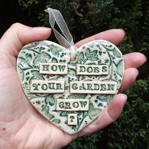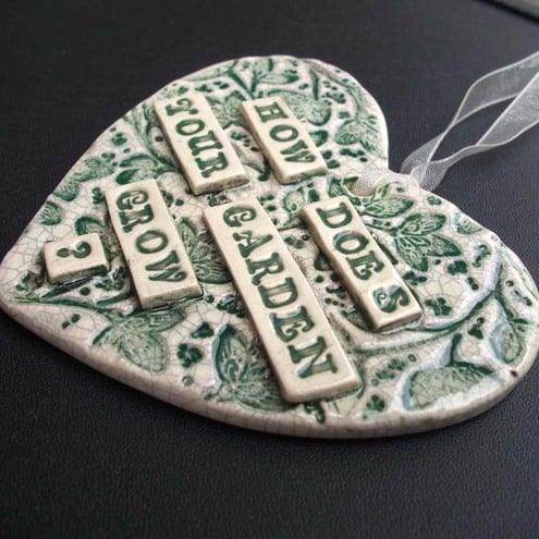 This ceramic heart is made from white earthenware clay and decorated with the words "How does your garden grow? It has a green leafy background finished off with a crackle glaze for a shabby chic look.