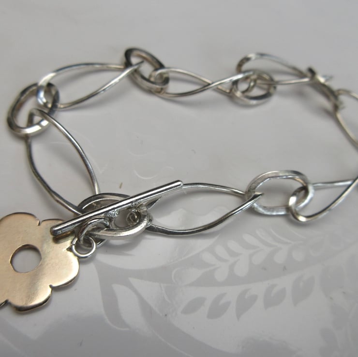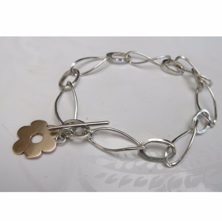 This bracelet has alternating twisted figure of 8 links and ovals, formed from square wire. Finished with a 9ct gold flower charm and a toggle clasp, everything has been handmade by me. Lovely worn on its own, but is also perfect to be used as a charm bracelet.