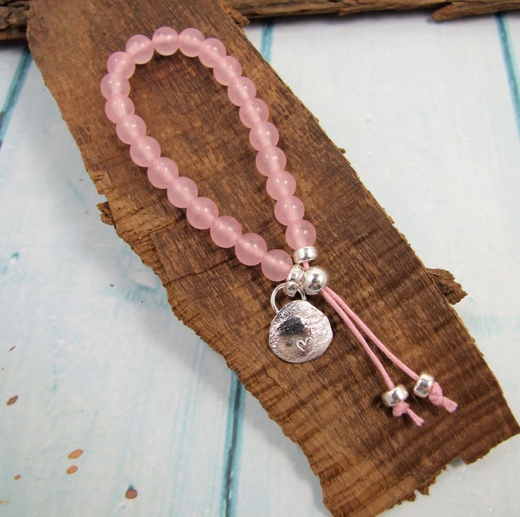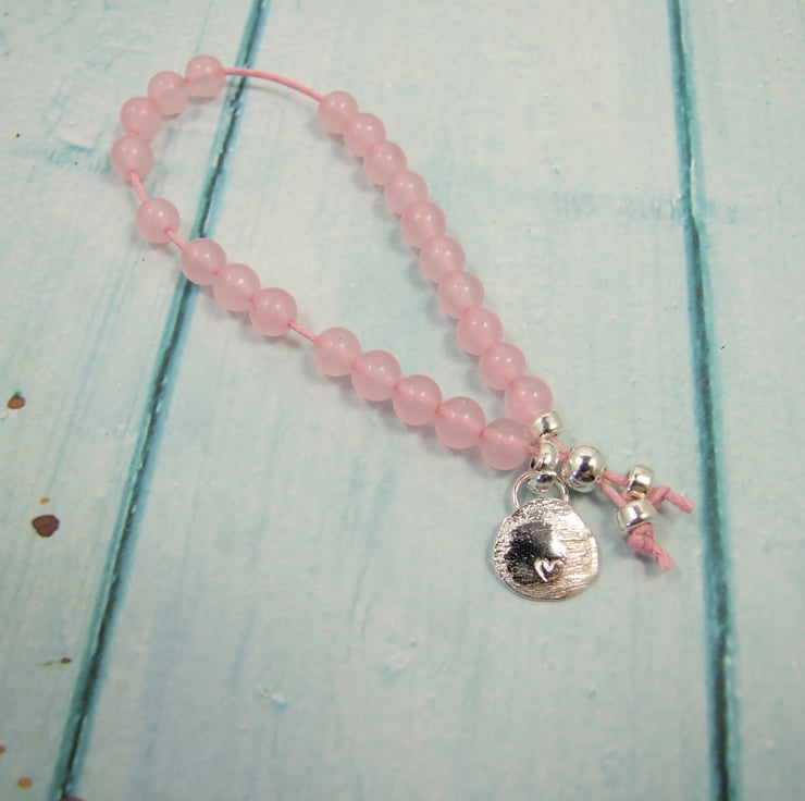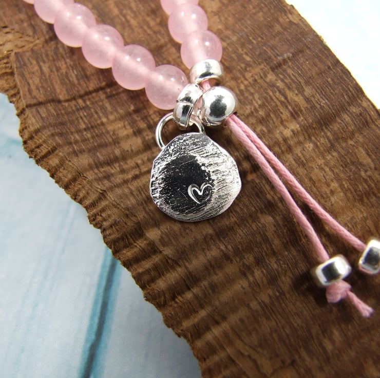 Beautiful baby pink rose quartz 6mm beads have been threaded onto pink cotton cord. The little charm has been created using recycled silver and hand stamped with a little heart. Fitted securely to the cord.