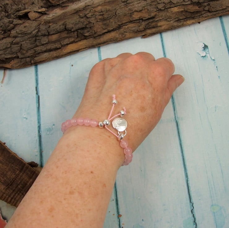 Rose Quartz Bracelet, with my own handcrafted Recycled Silver Charm, Sterling Silver Fittings with adjustable slider clasp on cotton cord.