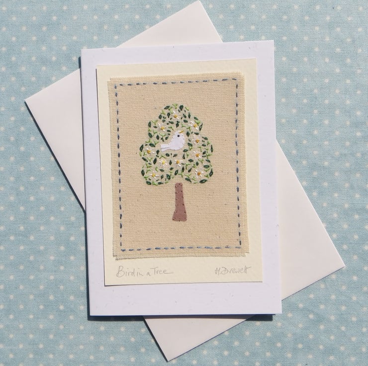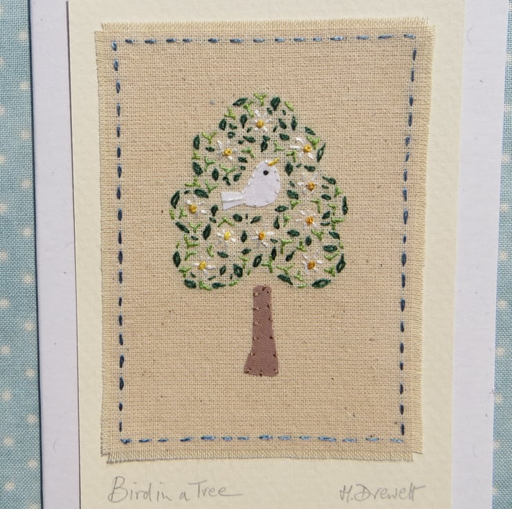 This is a hand-stitched textile miniature mounted onto greeting card. The tree is made up of leaves worked in a variety of stitches in three different greens, with tiny white silk flowers in-between. The bird is worked as an applique, as is the tree trunk, everything stitched into place with tiny stitches! This miniature piece of fine embroidery is a gift in itself to keep and frame, as well as a card in which to write your message.