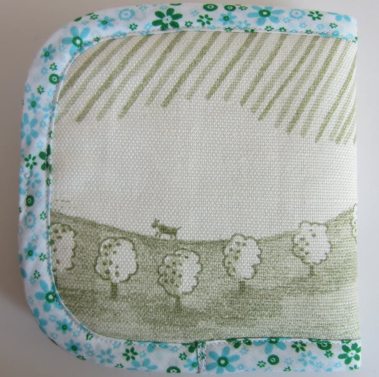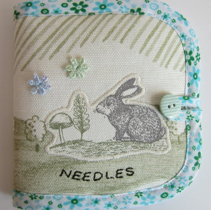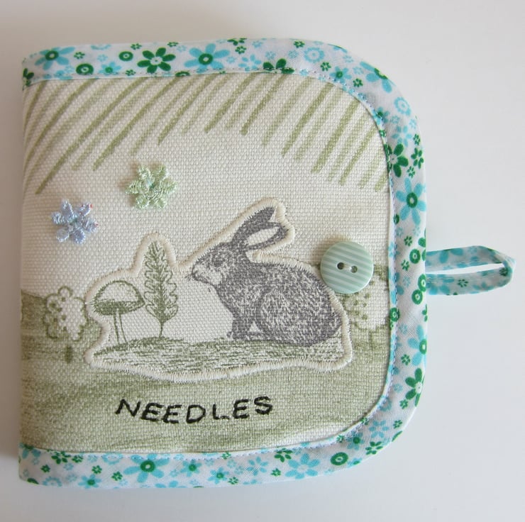 Lightly padded sewing needle case decorated with an appliqued rabbit, leaf and toadstool design and added flower embellishments. It is edged and backed with a pretty blue, green and white floral fabric.