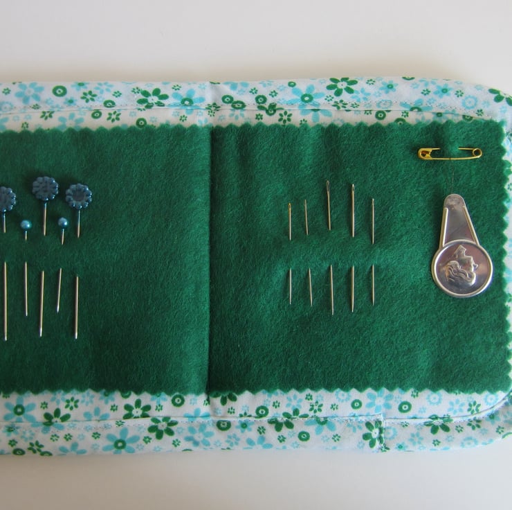 Inside there is a green felt page complete with needles, pins and a needle threader.