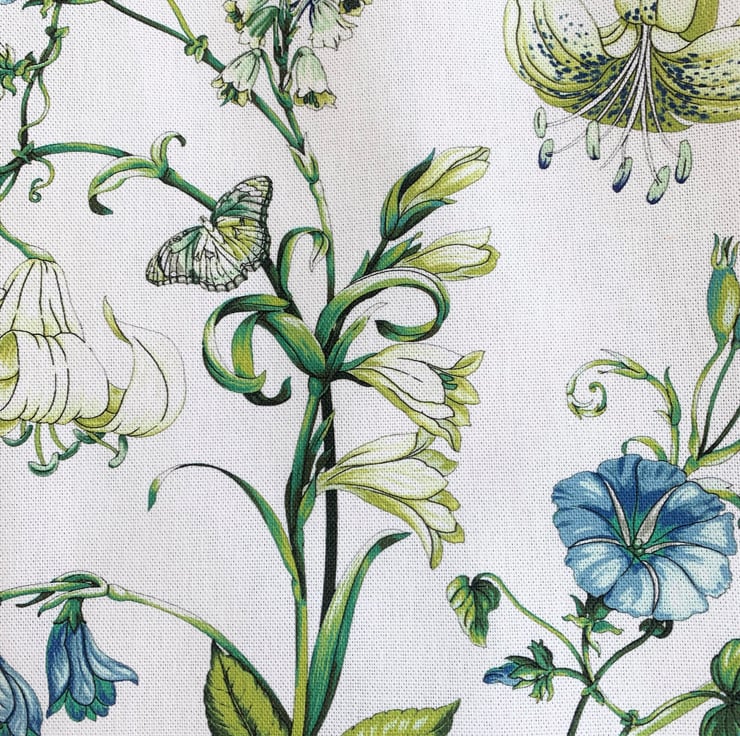 A pretty tote bag in a cream fabric with a floral print pattern in shades of cream, blue and green. The pattern features cream lilies and blue hibiscus flowers with zesty green stems and foliage. There is also a cream butterfly resting on one of the stems. The bag is lined with lovely lime green fabric.