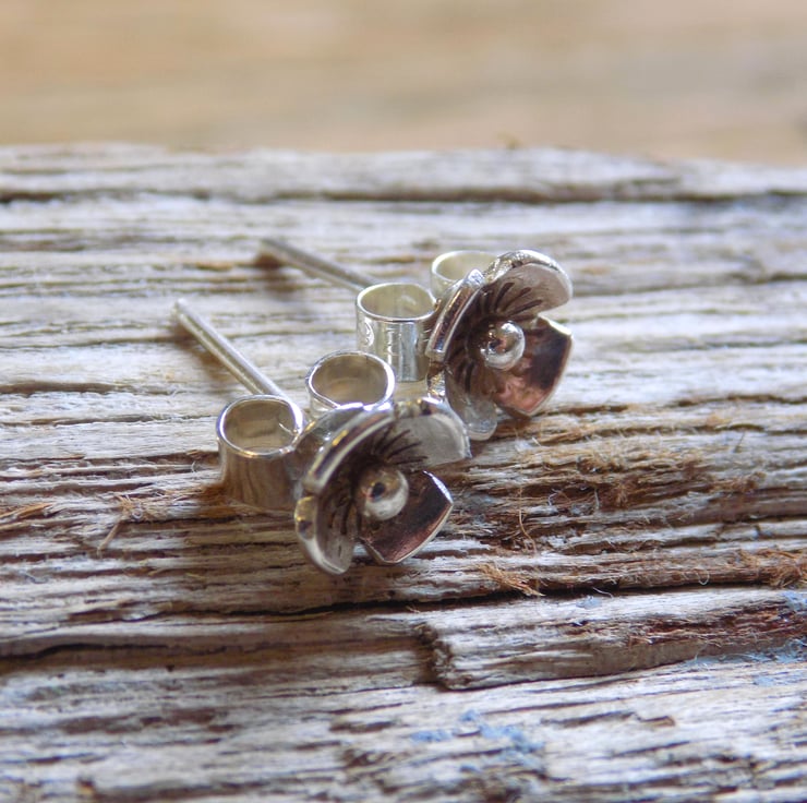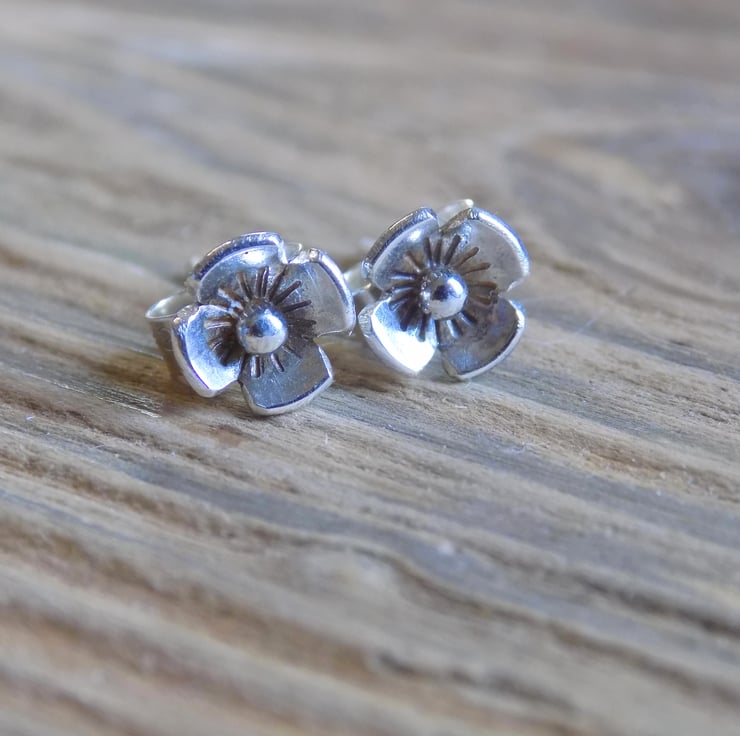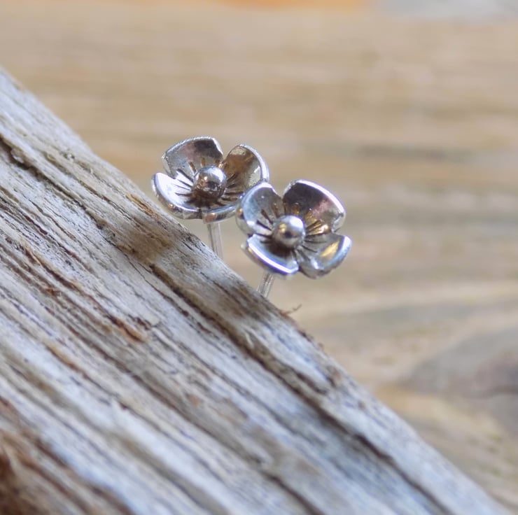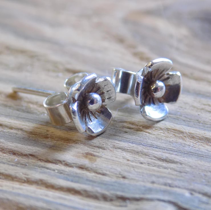 Made from sterling silver sheet and wire. The 7 mm flowers have been hand sawn from silver sheet, and soldered onto 0.8 mm posts which each have a butterfly back. Tumbled and polished to a high shine.
