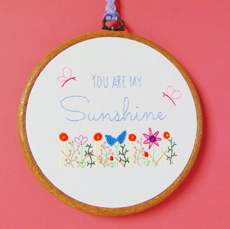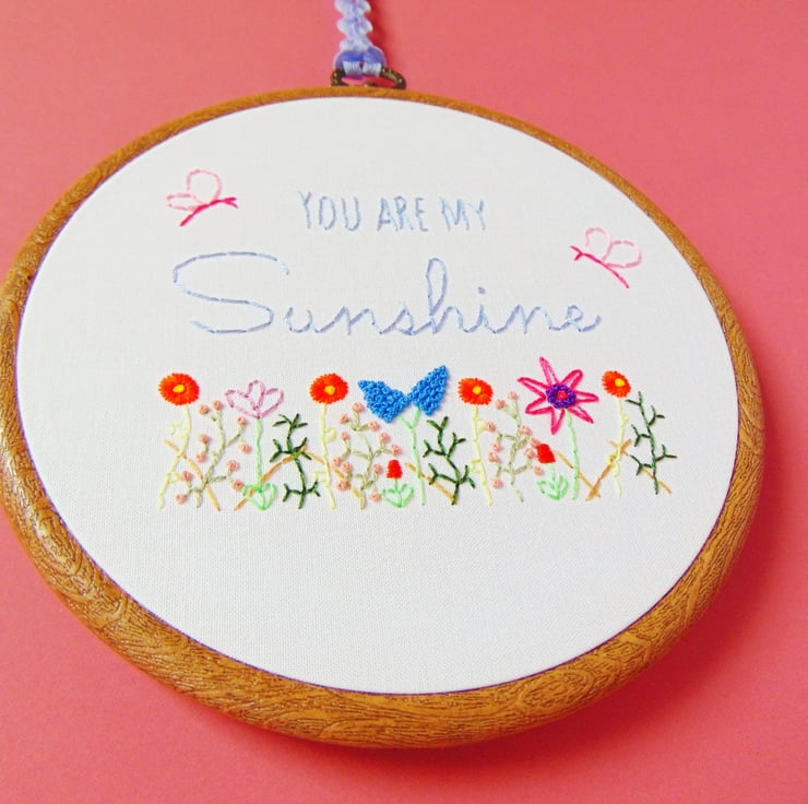 Everyone knows this special nursery rhyme we sing to our children at bedtime. This beautiful hand stitched 'You Are My Sunshine' hoop is the perfect gift for your little ones. It features the quote in a swirly and simple font mix, two fluttery butterflies and a gorgeous wildflower garden. I can stitch the quote in any colour, it is sewn onto white cotton and set in a six inch embroidery hoop.