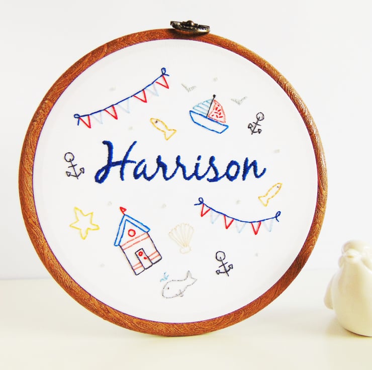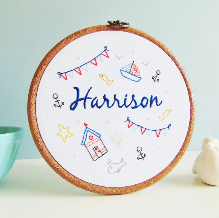 By The Seaside is an original Flossy Stitch design which features an array of nautical delights including a boat, bunting, beach hut, anchors and more. Not only that, it can be personalised with any name in any colour in the middle and it is sewn onto white cotton. Finally, once hand sewn to order it is set in a six inch embroidery hoop with ribbon for hanging.