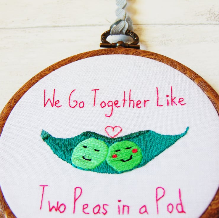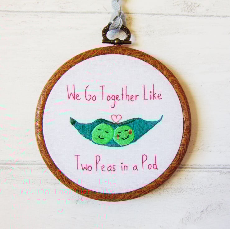 This super cute 'Two Peas In A Pod' hand stitched hoop is the perfect gift whether its your anniversary, a mother daughter treat or something for your bestie. Its adaptable to suit all and features the words 'We go together like two peas in a pod'. This is hand sewn to order with any text colour and set in a four inch hoop.