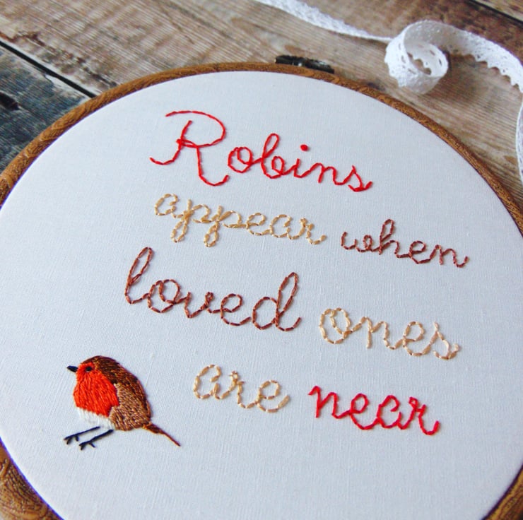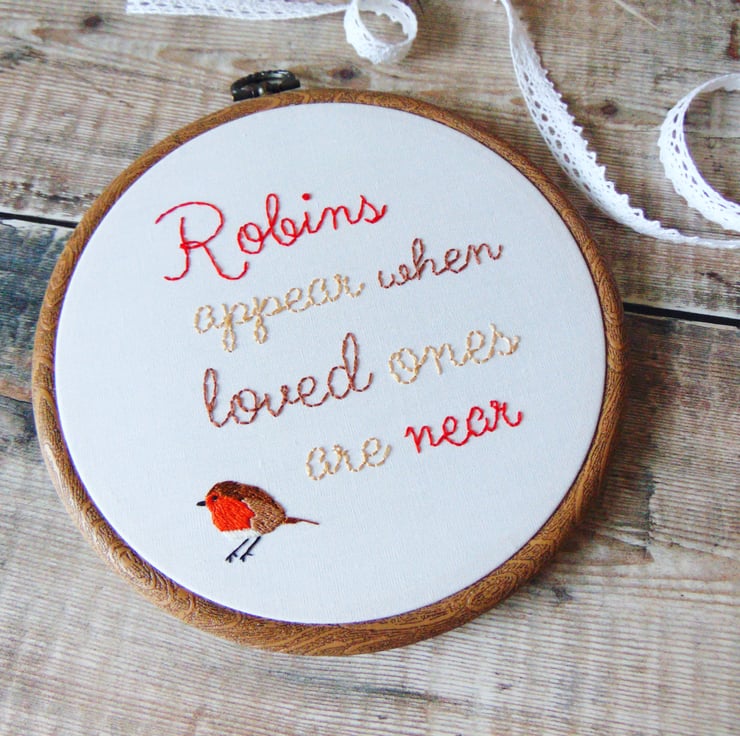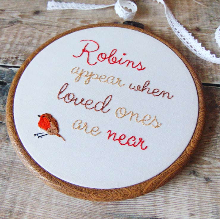 This beautiful hand stitched 'Robins and Loved Ones' hoop is the perfect memorial gift for something who has lost a loved one. Whenever we see robins in our garden we always think of our late grandfather, as do many when robins appear they think of loved ones. This hand stitched hoop is made to order and set in a six inch embroidery frame. I can change the wording to suit your preference.