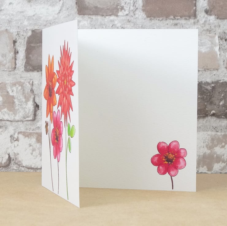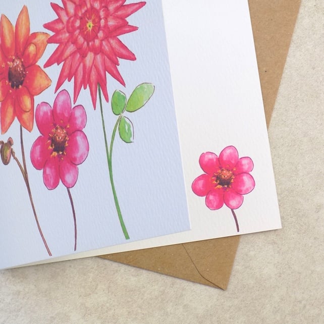 This eco friendly blank card 'Dahlias' has been printed using my original artwork on to 100% recycled felted white 270g card and has been left blank inside for your own special message. This is a lovely card for a Birthday, thank you, get well or any occasion. This eco friendly felted white card has a lovely textured finish.