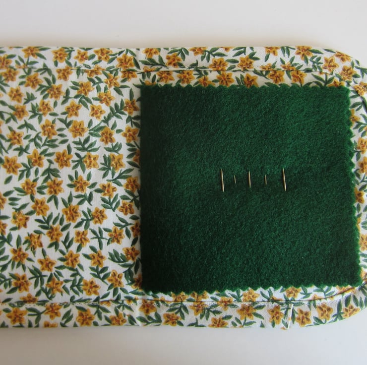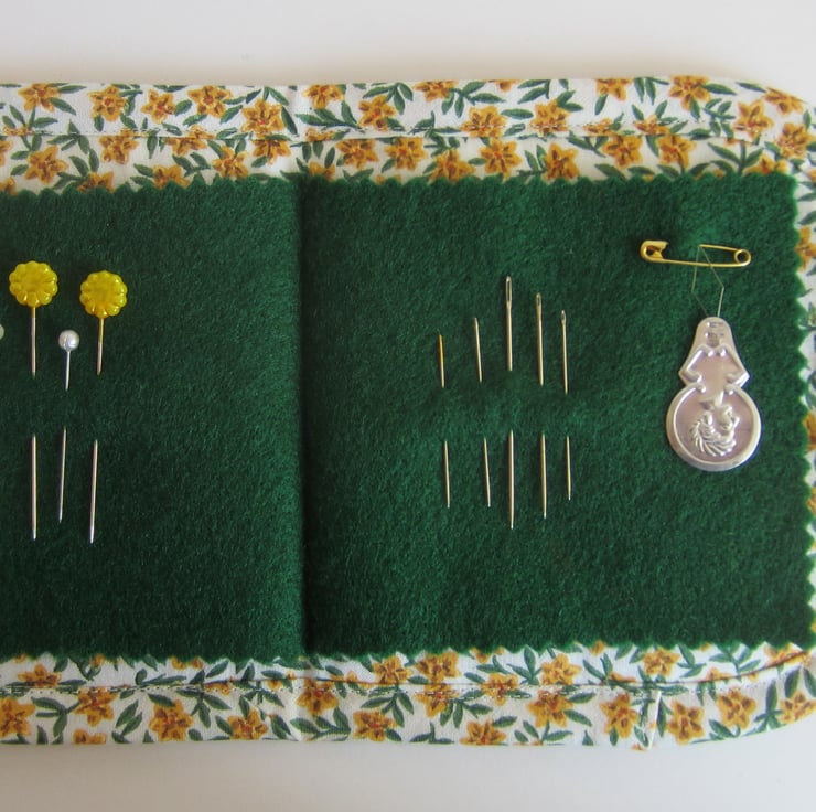 Inside there is a dark green felt page complete with needles, pins and a needle threader.