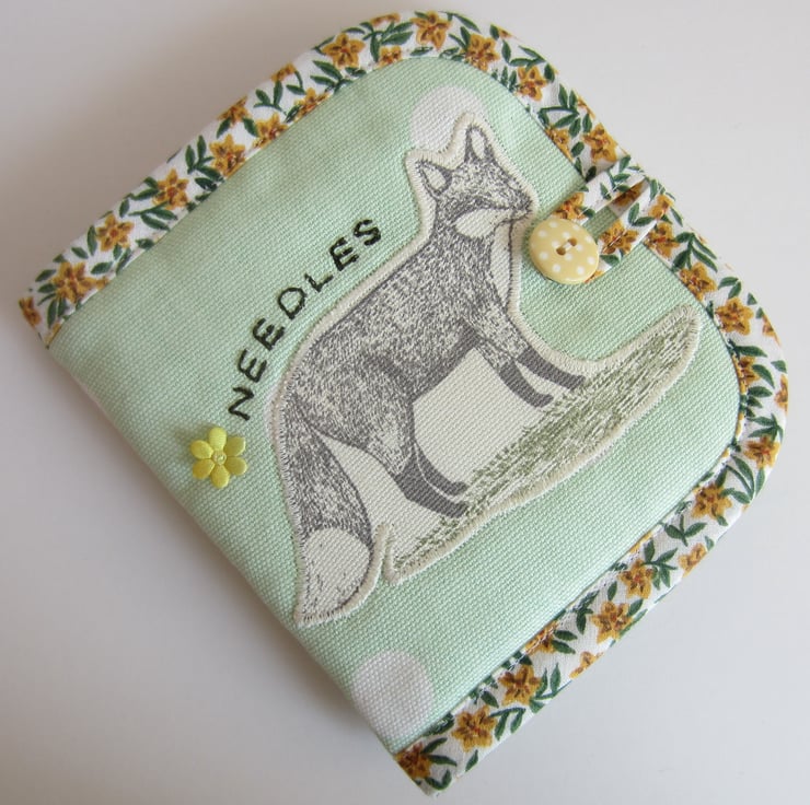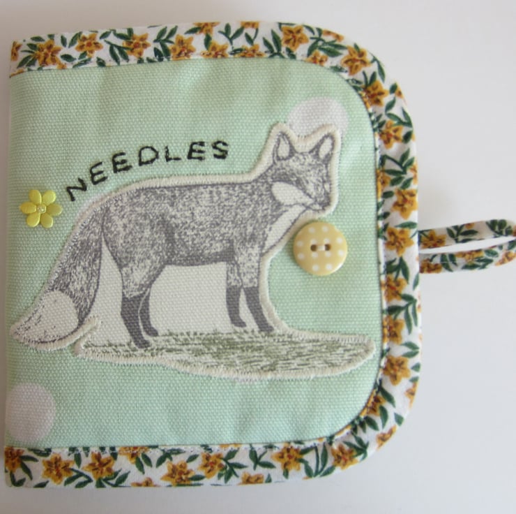 Lightly padded needle case decorated with an appliqued fox and a yellow flower embellishment on a pale green and white spot background. It is edged and backed with a pretty yellow, green and white floral fabric.