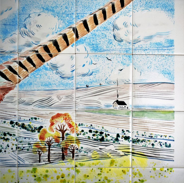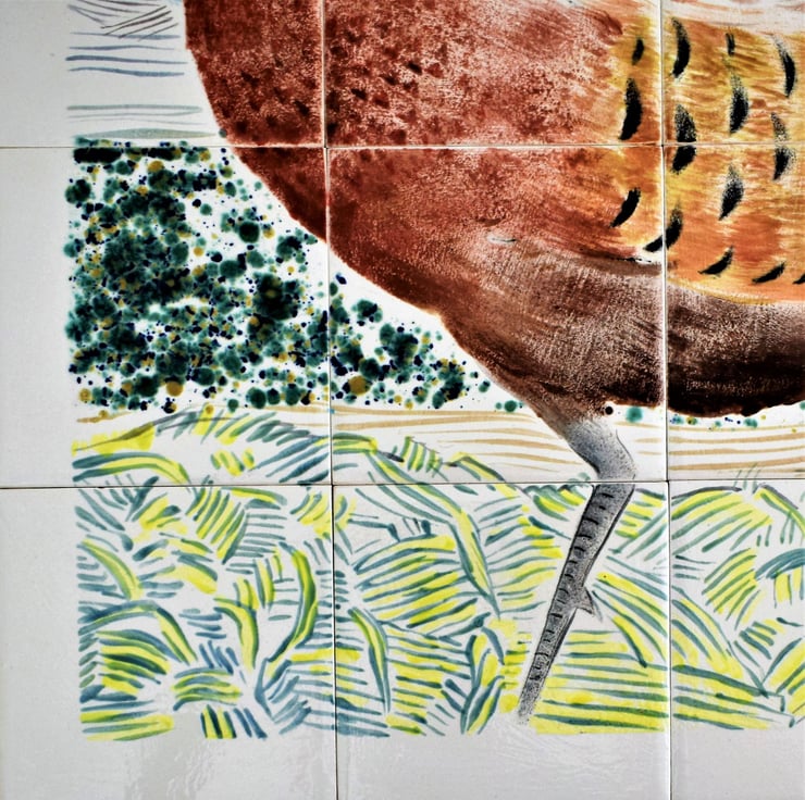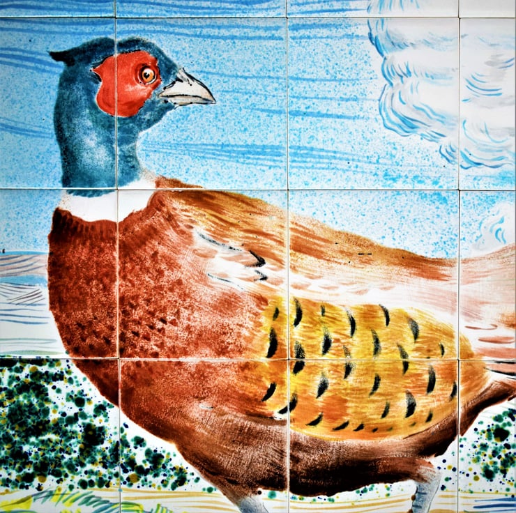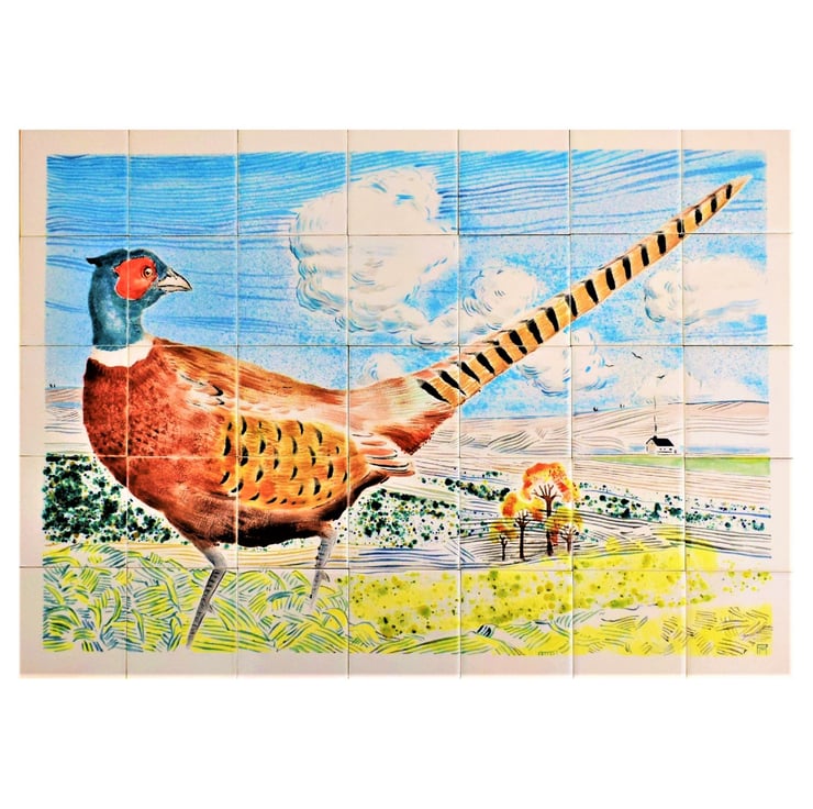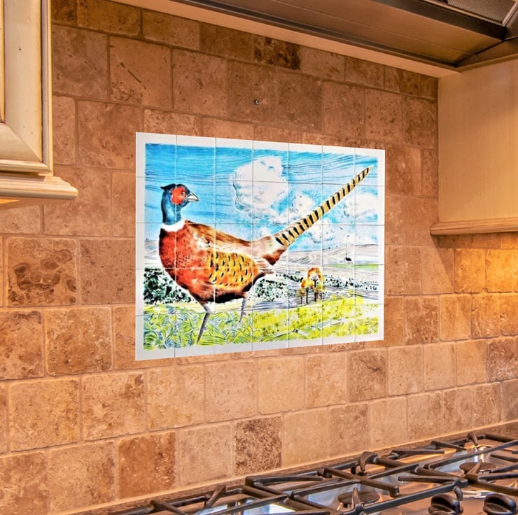 This is a hand-painted ceramic tile splashback, featuring a lovely country scene with a brightly coloured pheasant.