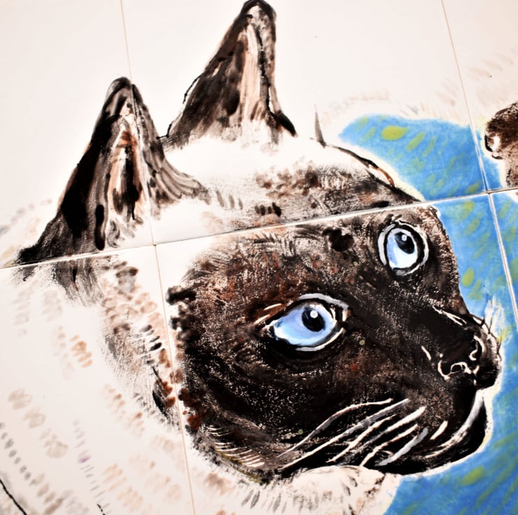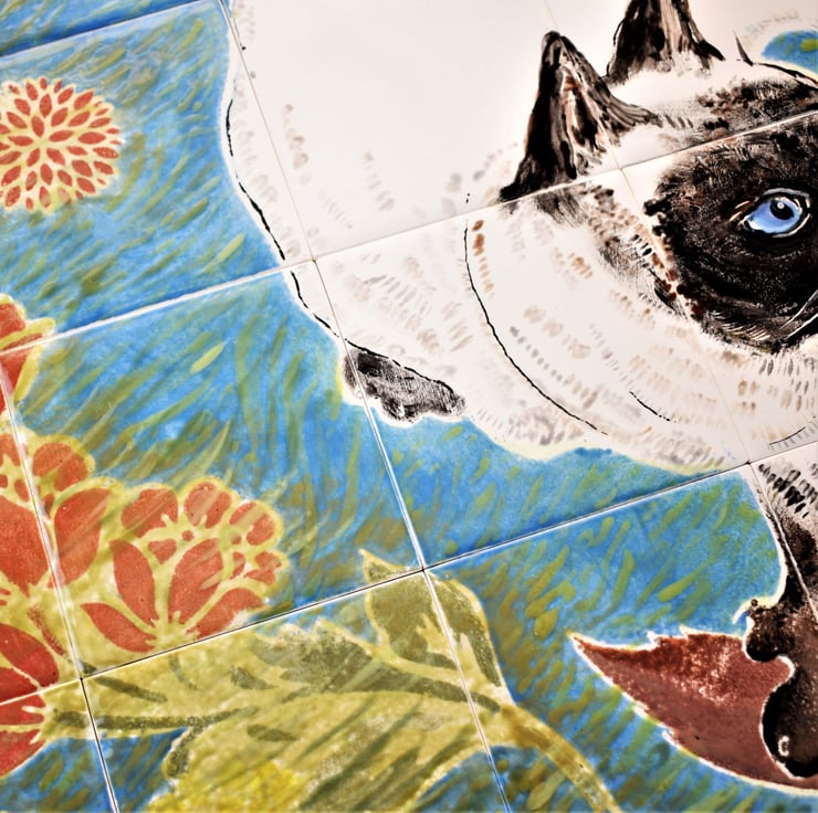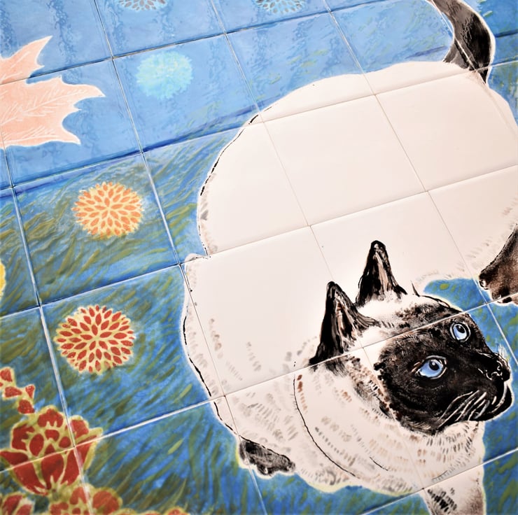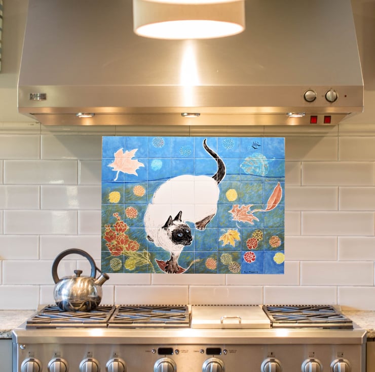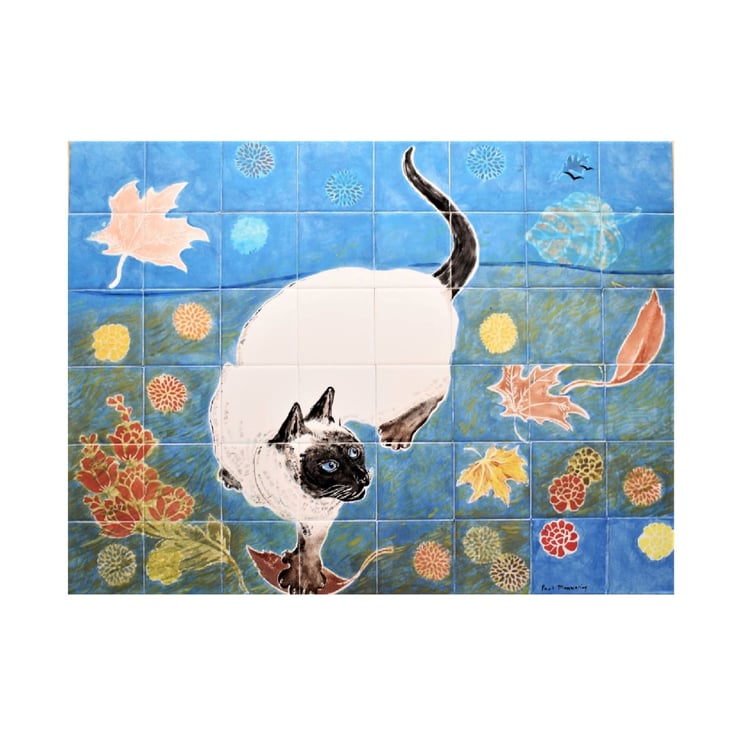 This handmade mural has a highly spirited siamese cat, spinning and pouncing on windswept leaves.