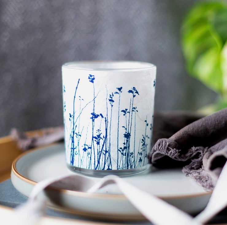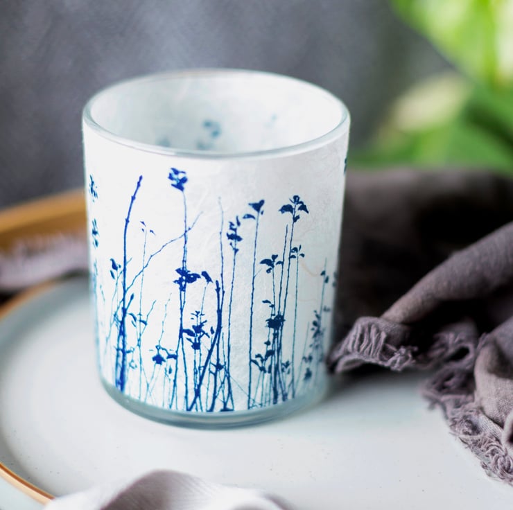 This unique candle holder is created using the old photographic process of Cyanotype. A light sensitive solution is applied to mulberry paper, objects or negatives layered on then exposed to sunlight, the solution is then rinsed off and the paper dried, fixing the image in lovely blues. To make these candle holders the paper is then applied to glass. The thinness of the paper allows the light to shine through the image.