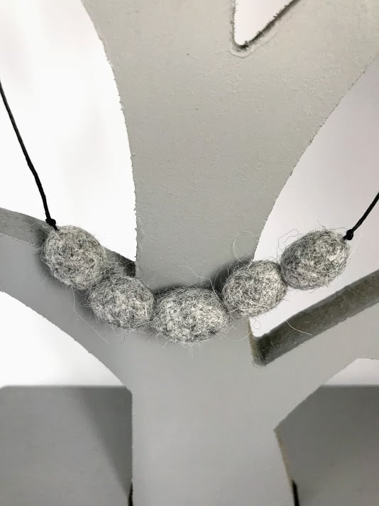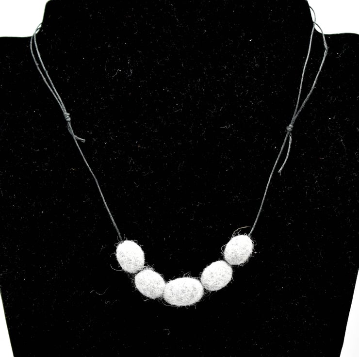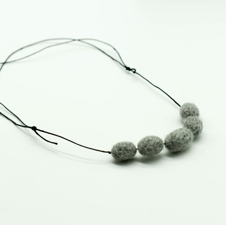 This statement necklace has been created using five felted beads made from grey baby alpaca wool and strung on grey 0.5mm hemp cord.