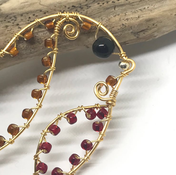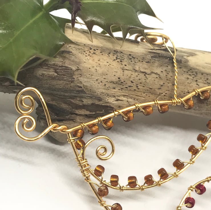 I have created a bird shape using gilt coloured copper wire with swirl details for the wing and tail feathers. Red and bronze seed beads are wrapped around the bird shape with a pale gold bead for the beak and a black glass bead for the eye. A hook is also included for hanging the decoration.