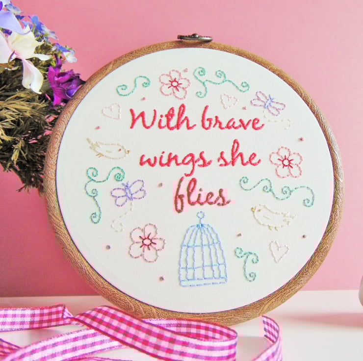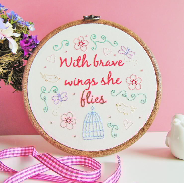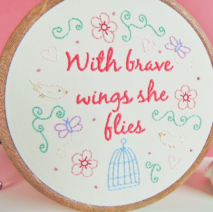 This pretty 'With Brave Wings She Flies' hoop is the perfect gift for your daughter or friend. It features an array of hand stitched pastel pretties including a birdcage, swirls, flowers and butterflies. This hoop is entirely hand sewn to order in soft pastels and pinks onto cream cotton and set in a six inch embroidery frame.