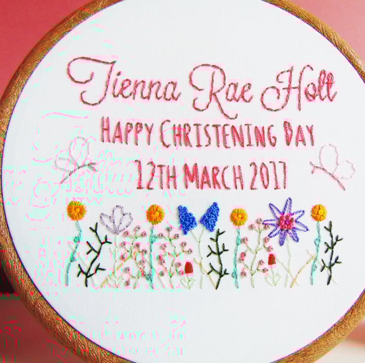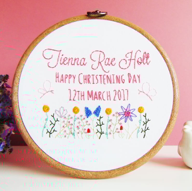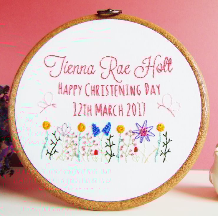 This beautiful wildflower theme hoop is the perfect pretty christening or naming ceremony gift. It features my signature hand stitched wildflower garden filled with pretty flowers, two fluttery butterflies and any personalisation of your choosing. These are hand sewn to order onto white cotton and set in a six inch embroidery hoop.