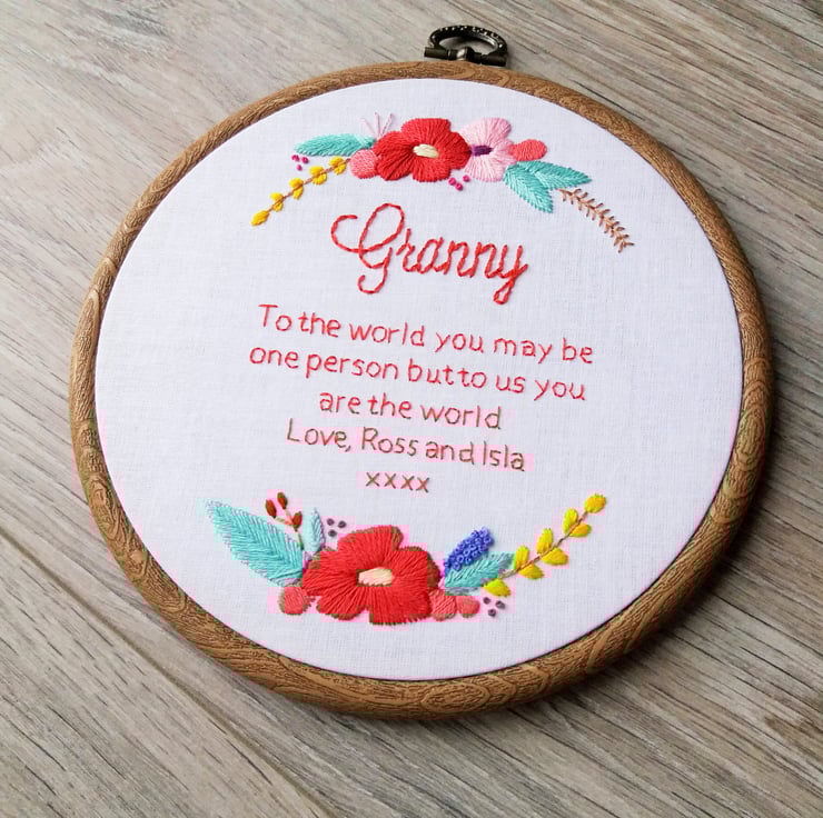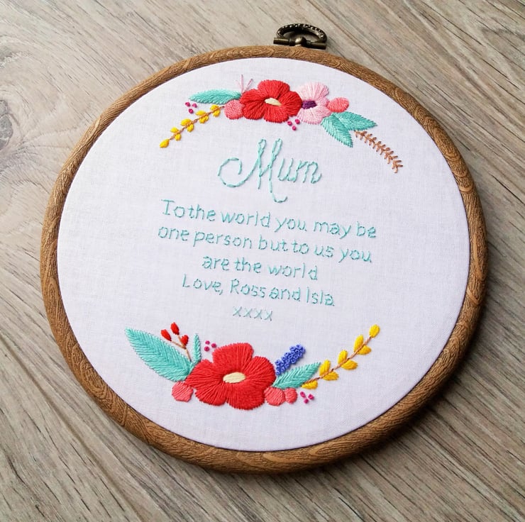 This beautiful hand stitched 'To The World' hoop is the perfect gift whether it be for your mum, sister, auntie, grandma - anyone! It features the quote 'To the world you may be one person but to us you are the world'. This quote can be changed and personalised to suit you and also includes two gorgeous floral displays. This design is sewn onto white cotton, any colours you'd like and set in a six inch hoop.