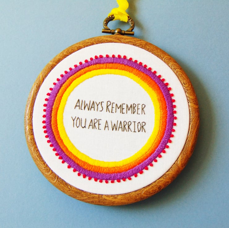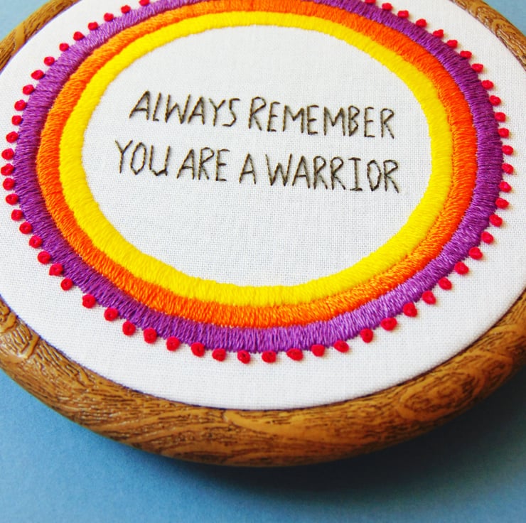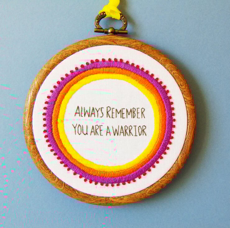 This bright and beautiful hand stitched 'Always Remember You Are A Warrior' hoop is the perfect gift if someone you love is recovering from illness or trauma. It reminds them they can get through difficult times and you are thinking of them. Hand sewn to order onto white cotton; these can be stitched in any colours and are set in a four inch hoop. It features three individually hand sewn circles and a row of tiny pom pom French knots.