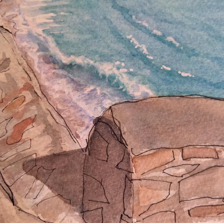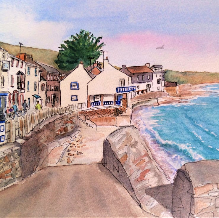My original watercolour "pen and wash" painting, of "The Cleave" in the lovely village of Kingsand, Cornwall, looking down towards the beach. Based on my own photograph, taken in early summer 2019.