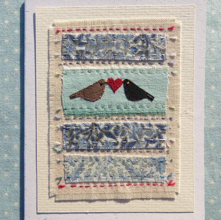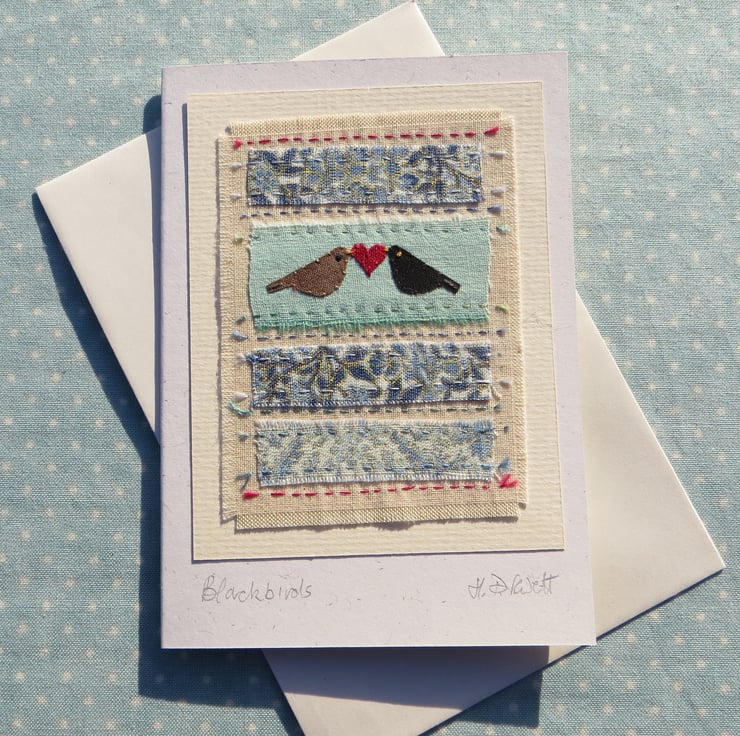 I love watching garden birds, and have enjoyed drawing them since childhood! Now I stitch them and love to put them with pretty fabrics on my cards and in my framed work too. Mrs Blackbird is brown, Mr Blackbird is black.