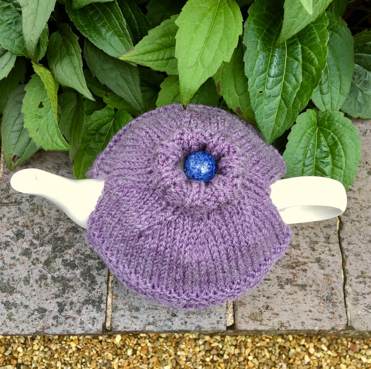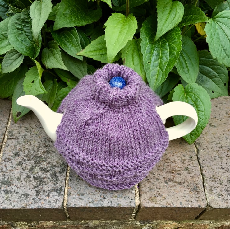 I have knitted this teapot cosy using a wool and acrylic mix yarn. The tea cosy will fit a standard 4-6 cup (1 litre) teapot and the roll brim bottom allows for different heights of teapot. The roll down neck can sit nicely around the top of a teapot.