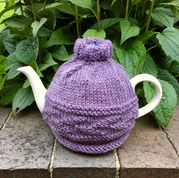 A hand knitted heather tea cosy that has a lovely leaf design pattern running around the middle and a ribbed polo neck top.