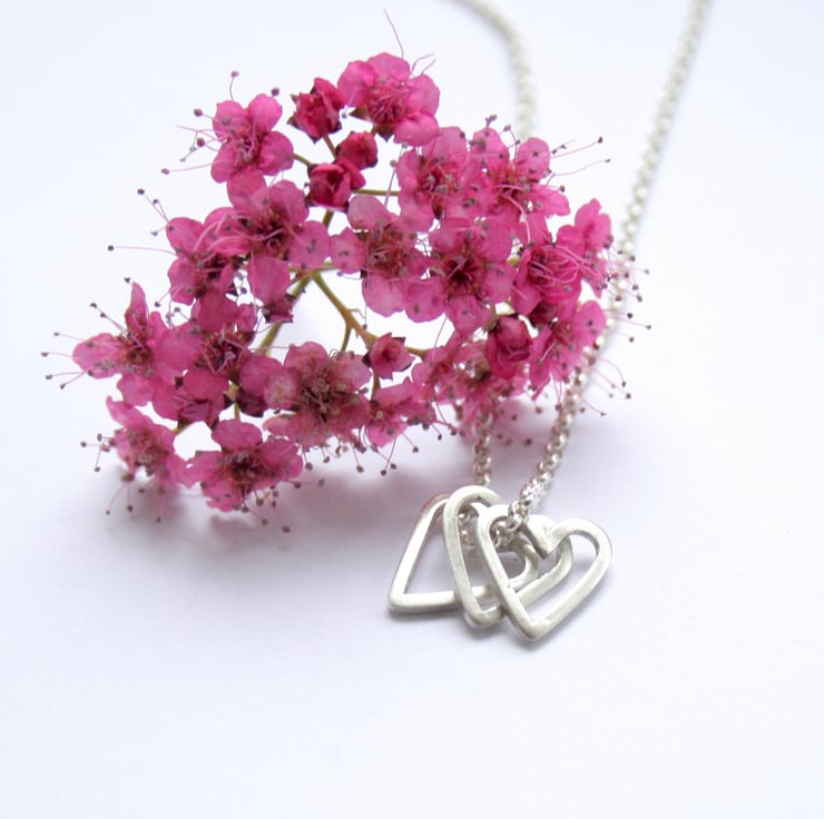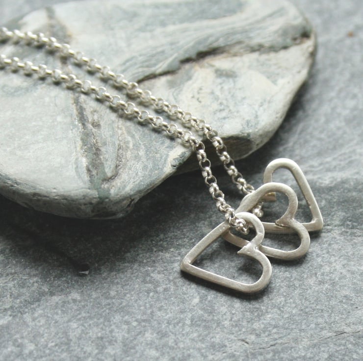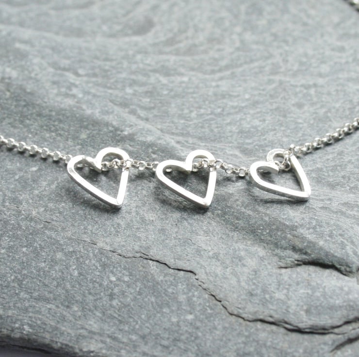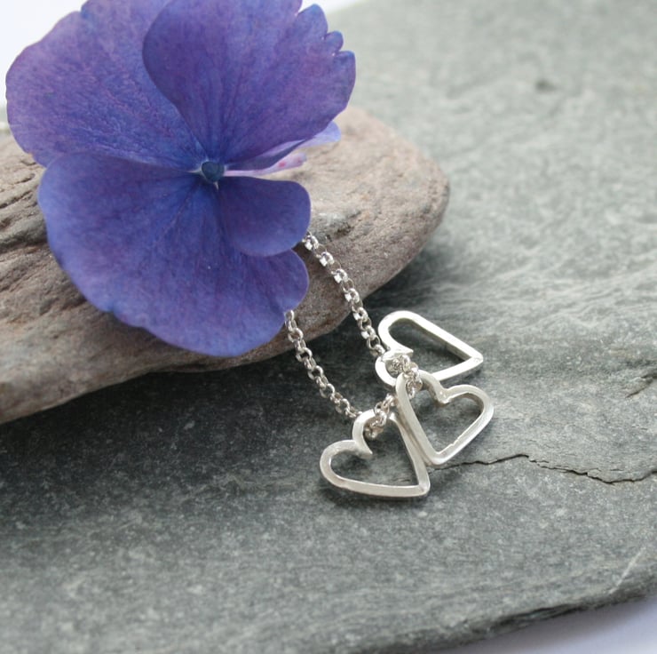 This handmade silver heart necklace has three open hearts which can move freely along the chain. I have made the hearts from square sterling silver wire and although I have made this necklace with three hearts although the number can be varied. If you number you require is not listed then please contact me to arrange your order.