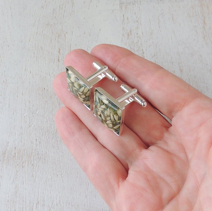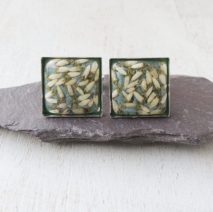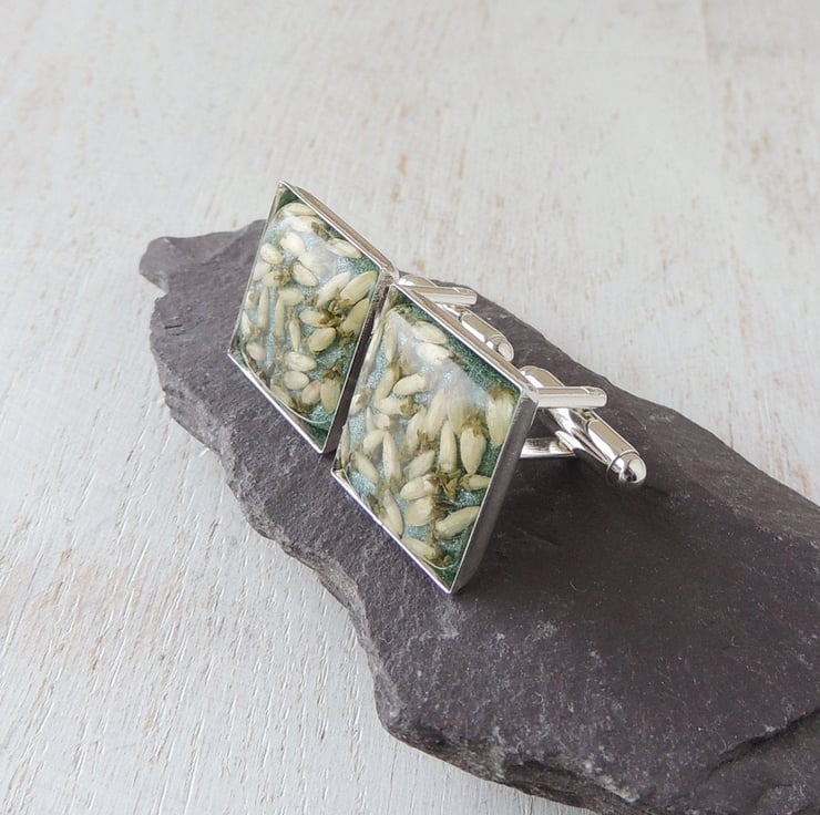 These flower cufflinks have little white heather flowers captured in square blue resin cabochons.