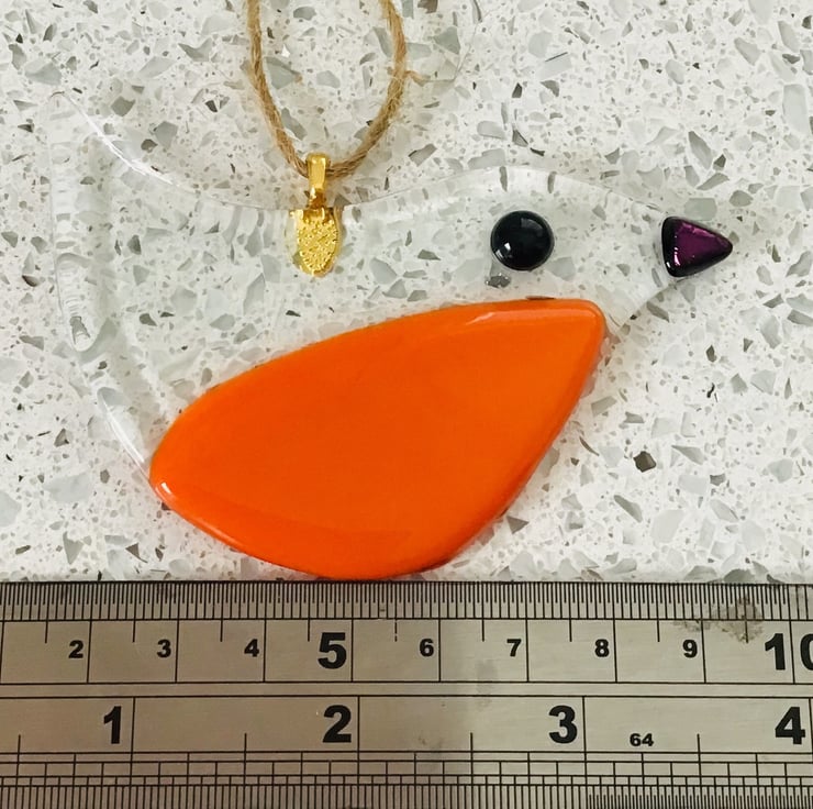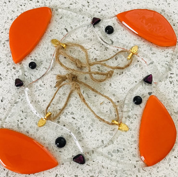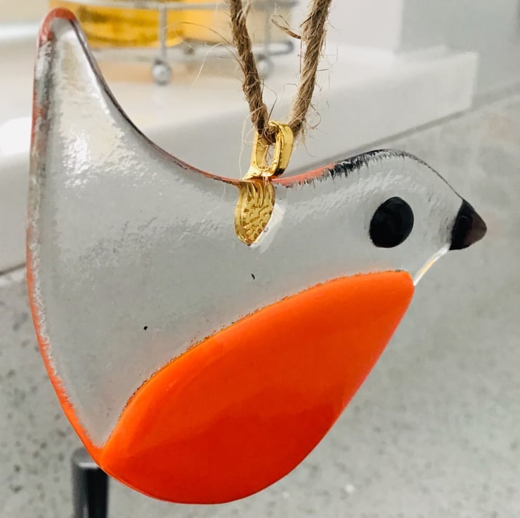 Fused glass robins approx 4 in in size . Clear glass with dichroic black beak and red belly . Hang with string from a small gold hanger. Hand cut and fused by me in my workshop . The firing process takes approximately 12 hours