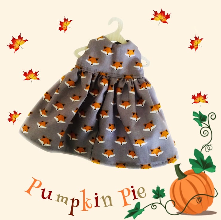 A little pale grey dress covered bright orange foxy faces in to fit the Mulberry Green characters. The dress is made from best quality cotton. has a lined bodice and a full skirt and it comes on a cute little wooden hanger.
