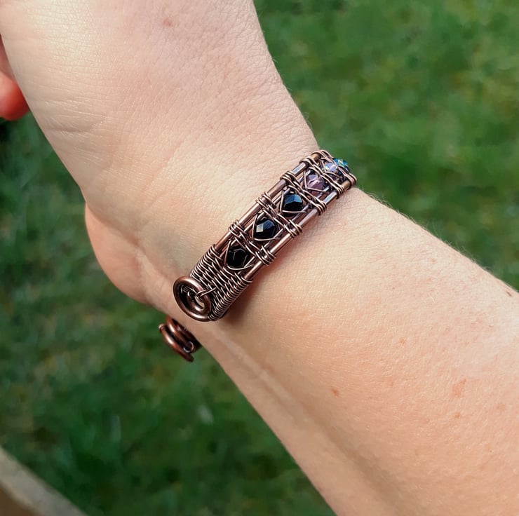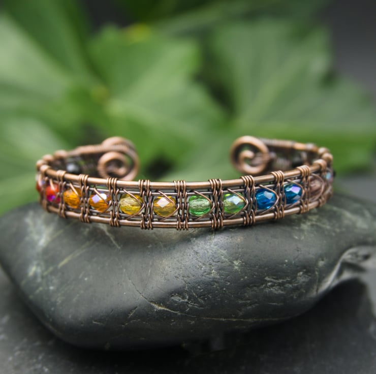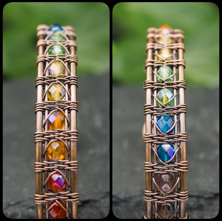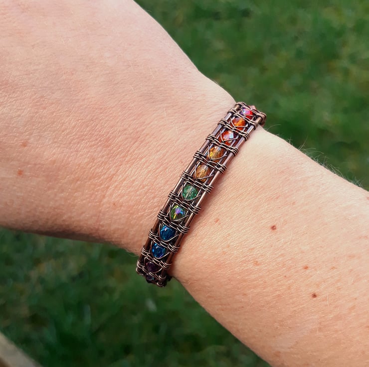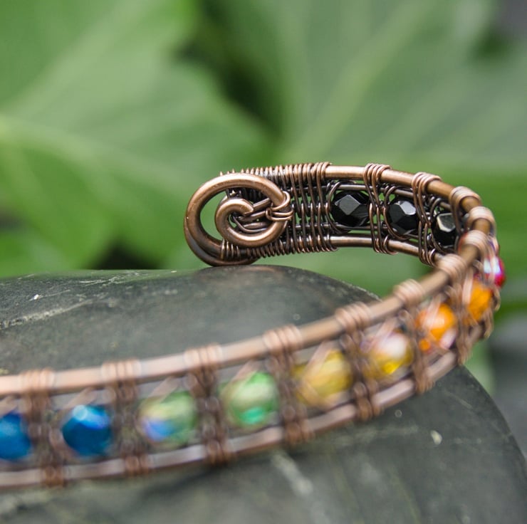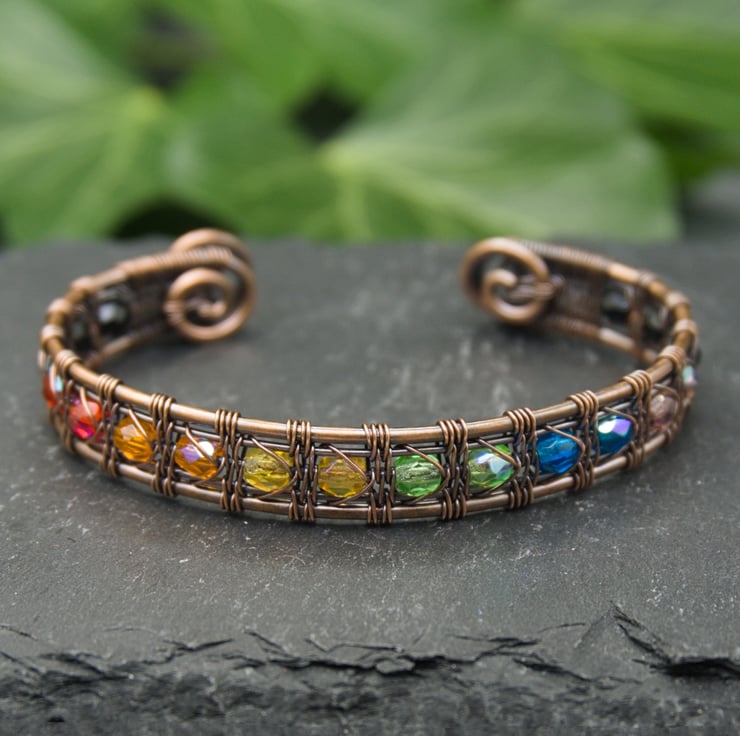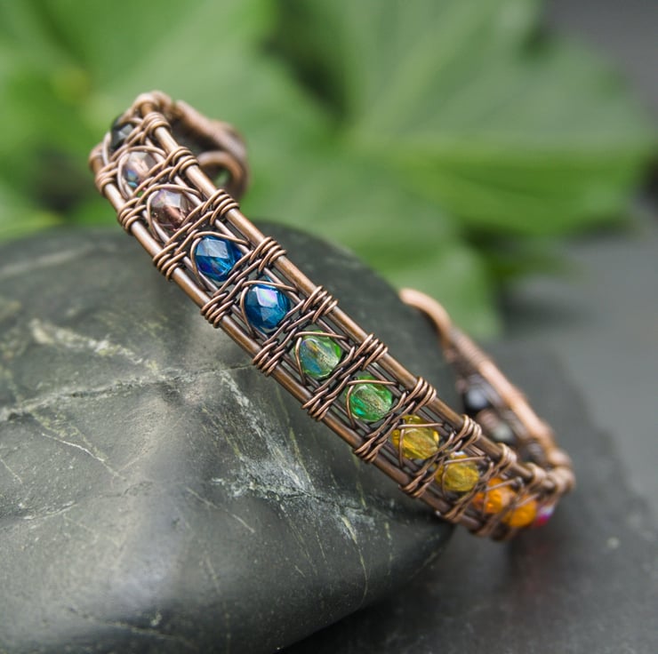 This beautiful rainbow cuff has been woven from copper wire using a variation on the snake weave. I've added faceted glass beads down the middle of the cuff in rainbow colours, each separated by two rows of weaving. There are eighteen beads in total - three black at each side, then two each of red, orange, yellow, green, blue and purple - the coloured beads have a half iridescent finish so they really twinkle as the light catches them.
