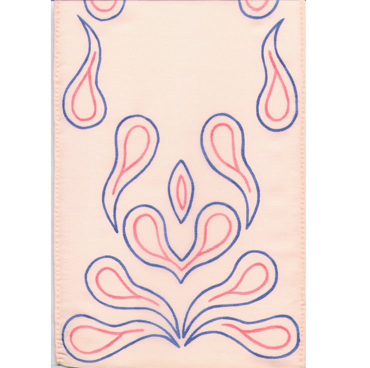 Pale pink scarf with pink and blue paisleys hand painted onto 100% silk crepe de chine – 3 in stock.