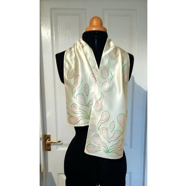 Cream silk satin scarf painted with pink and green paisleys onto 100% silk crepe backed satin – 1 in stock